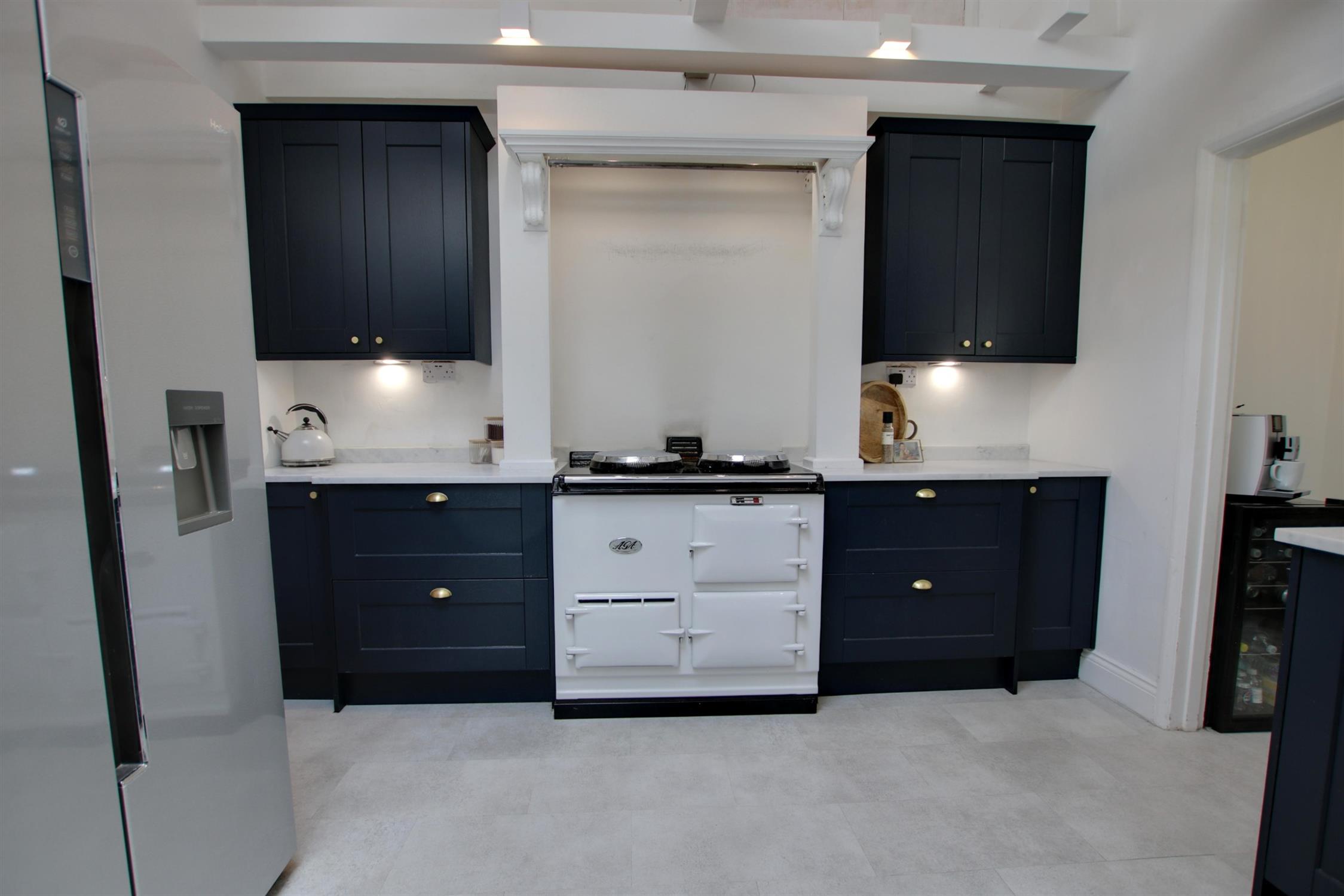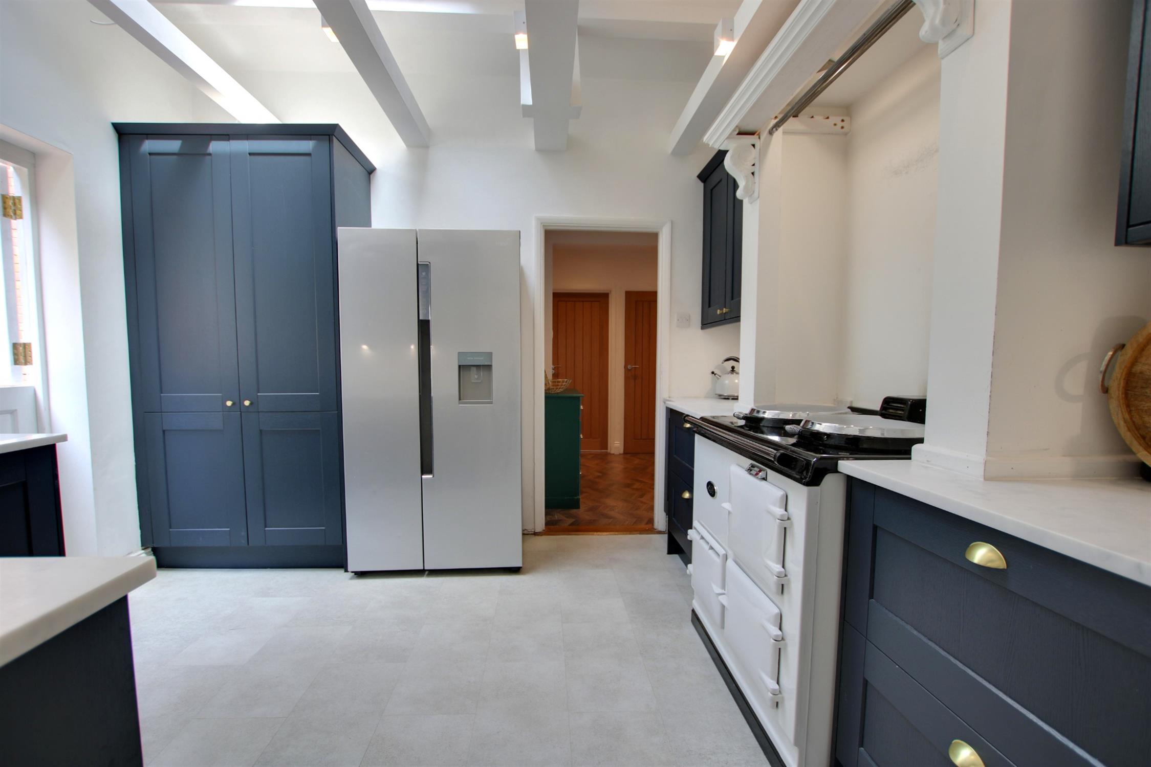 Double glazed Velux window to side aspect. Stable door opening onto rear garden. Single drainer sink unit with mixer tap and cupboard under. A range of matching eye level and base mounted units with quartz work surface over. Integrated washing machine and dishwasher. Space for American style fridge/freezer. Space for Aga.