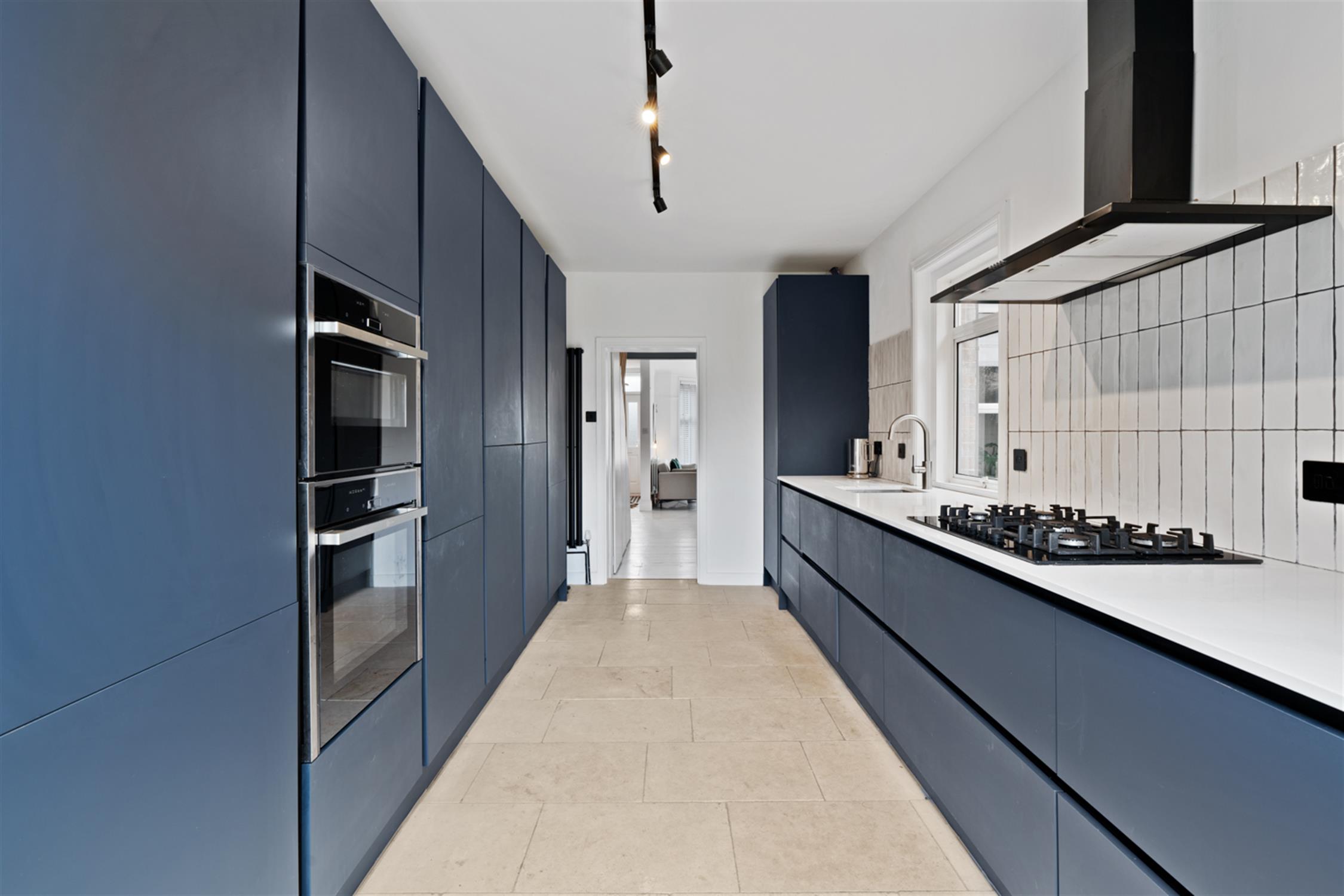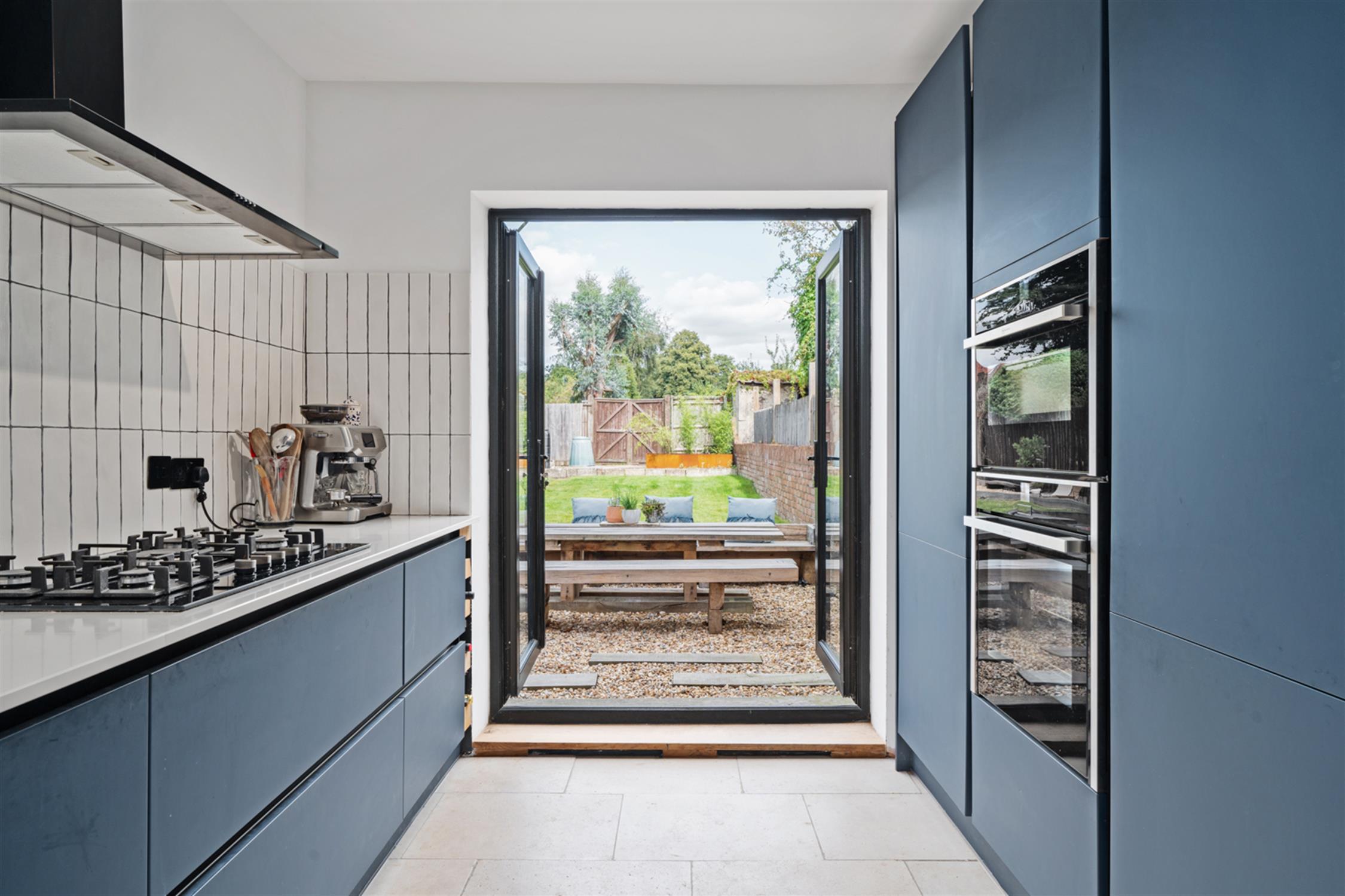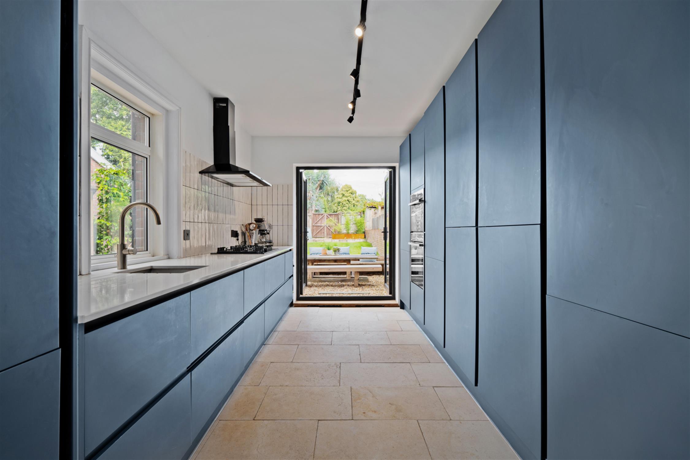 Tiled flooring. Tiled splashback. Matching floor and walls units with white quartz worktops over. Integrated dishwasher, washing machine and fridge/freezer. Gas hib and integrated electric oven. Inset sink with mixer tap. Double-glazed window to side aspect. Double glazed doors opening onto the garden.