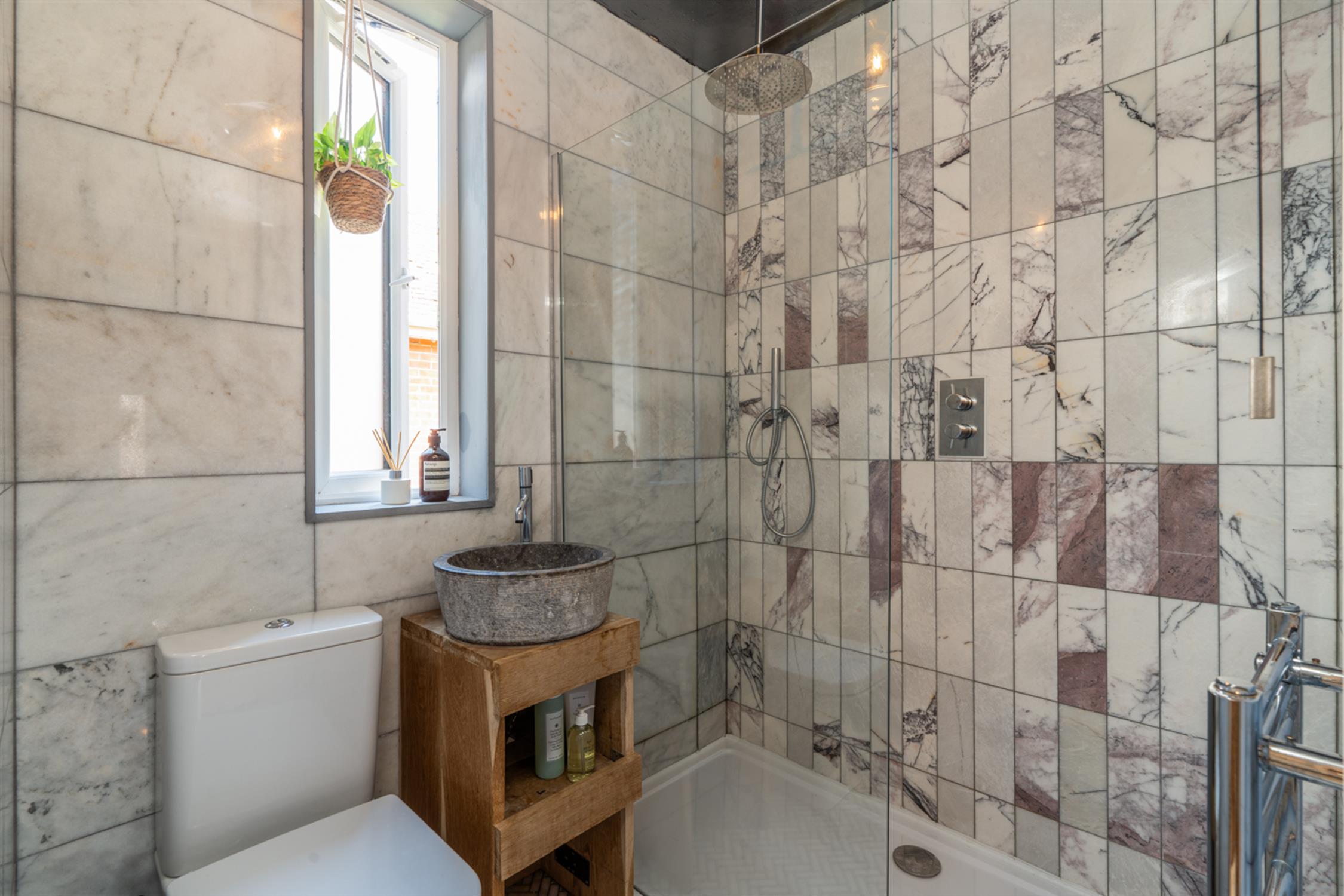 Tiled flooring. Tiled walls. Walk in shower cubicle. Low level W.C and wash basin. Extractor fan. Double-glazed window to side aspect. Heated towel rail.
