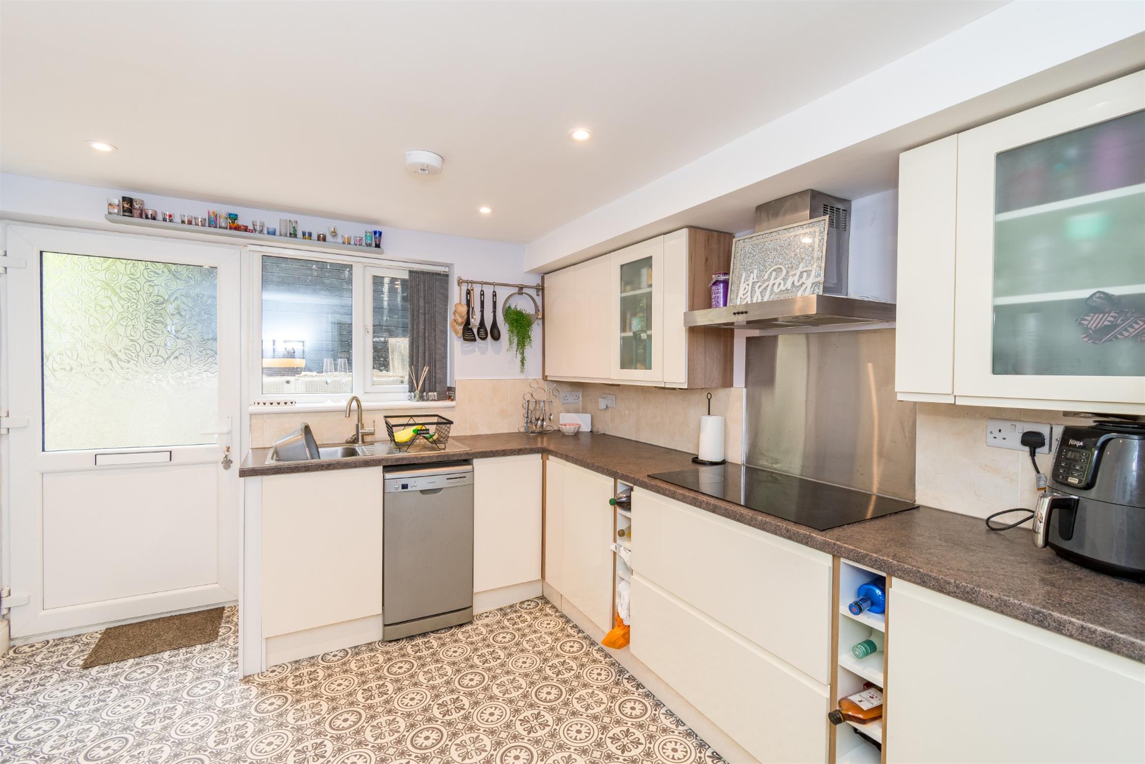 A fitted kitchen with a wide range of wall, base and draw units with a gloss finish above and below with roll top work surfaces over, built in ceramic hob, extractor hood over, integrated electric oven, built in cupboard housing boiler and fuse box, space and plumbing for a washing machine and dishwasher, double glazed window to front elevation, space for a tall fridge freezer, door to front elevation. space for dining,