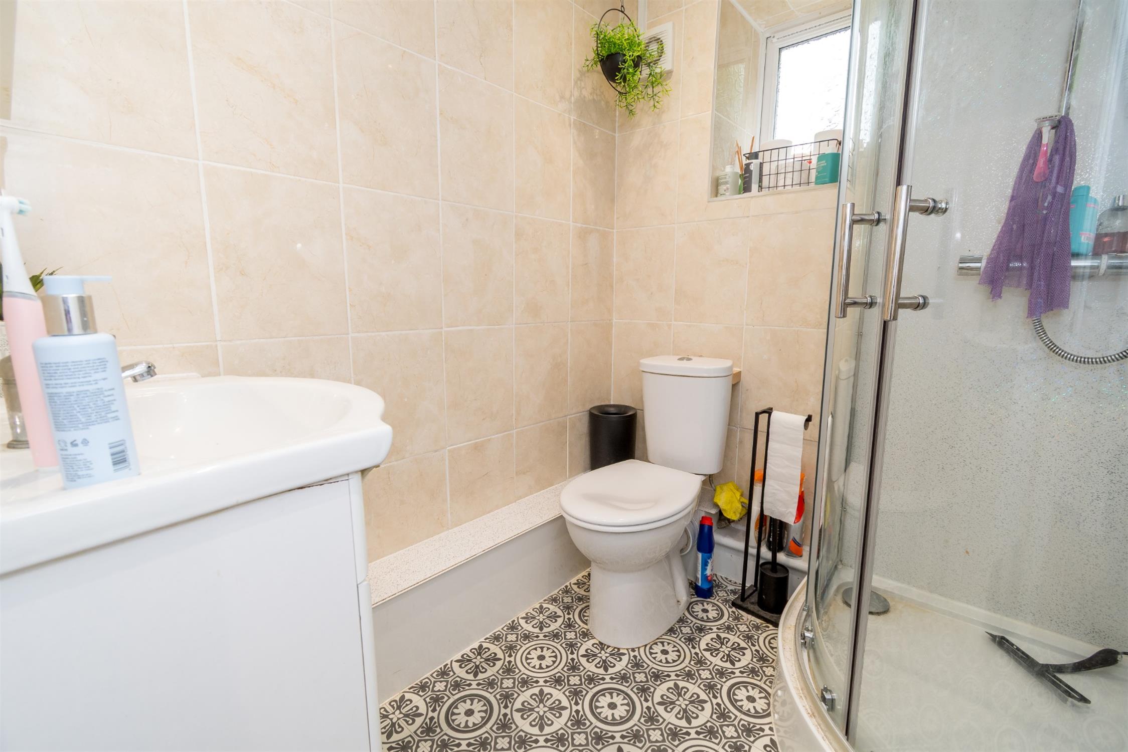 Built in shower cubical, built in vanity unit, low level WC, heated towel rail, double glazed window to front elevation.