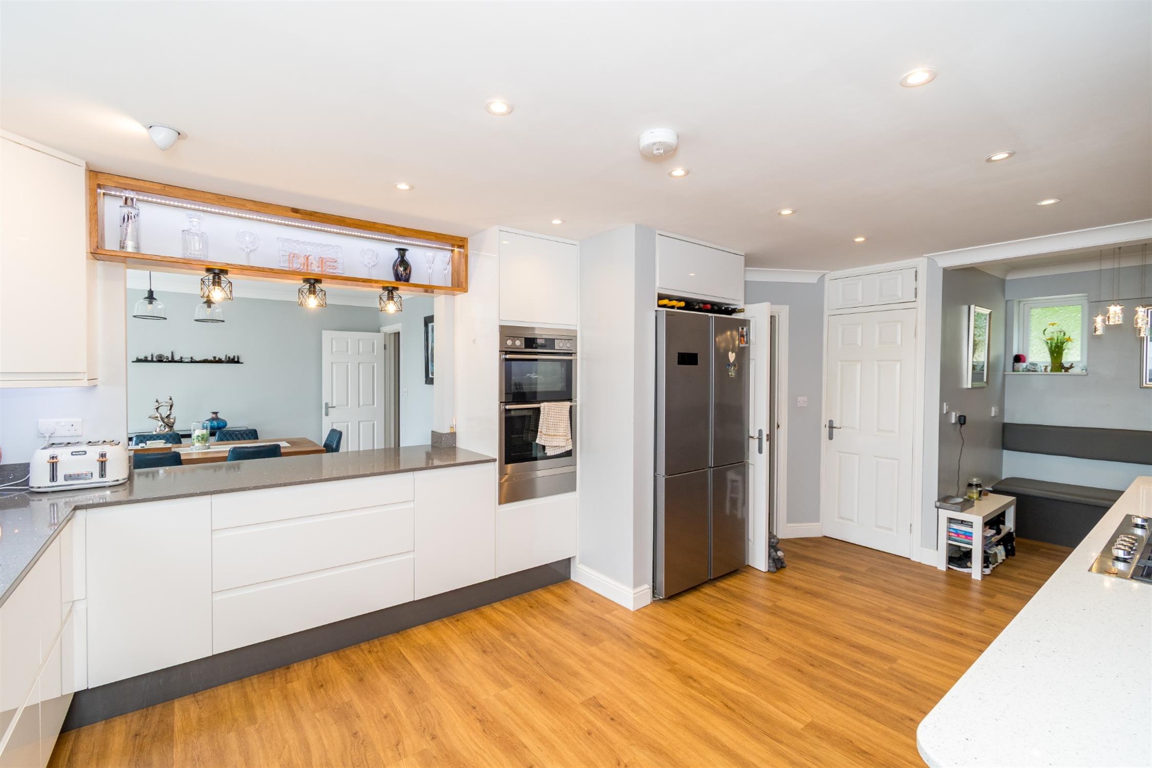 A fitted kitchen with a wide range of wall, base and draw units above and bellow with a gloss finish, under lighters and quartz work surfaces over, built in seating area, larder style built in cupboard, integrated gas hob with extractor over, stainless steel sink with mixer tap over, double glazed window to rear elevation, integrated double oven, space for a large fridge freezer, inset lights and Karndean flooring.