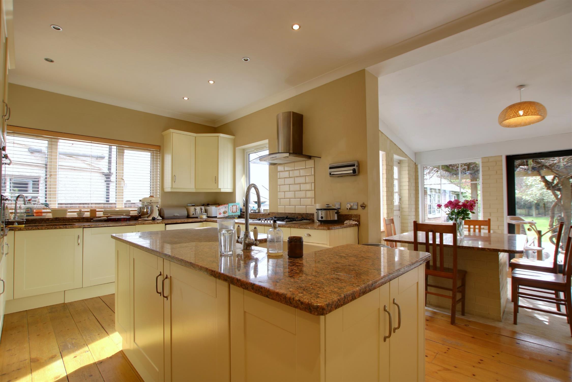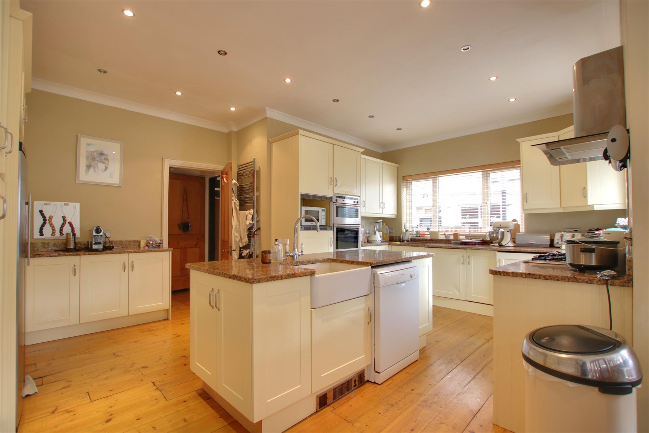 A particularly extensive range of eye and base level units to include a central island feature with under laid sink. Further under laid one and a half bowl sink with mixer tap fittings including granite work surfaces. Integrated washing machine, double oven, gas hob and extractor hood. Suitable space for American style fridge/freezer. Wood flooring. Smooth plastered and coved ceiling with inset spot lights. Floor mounted convector heater. Chrome finish ladder style radiator.