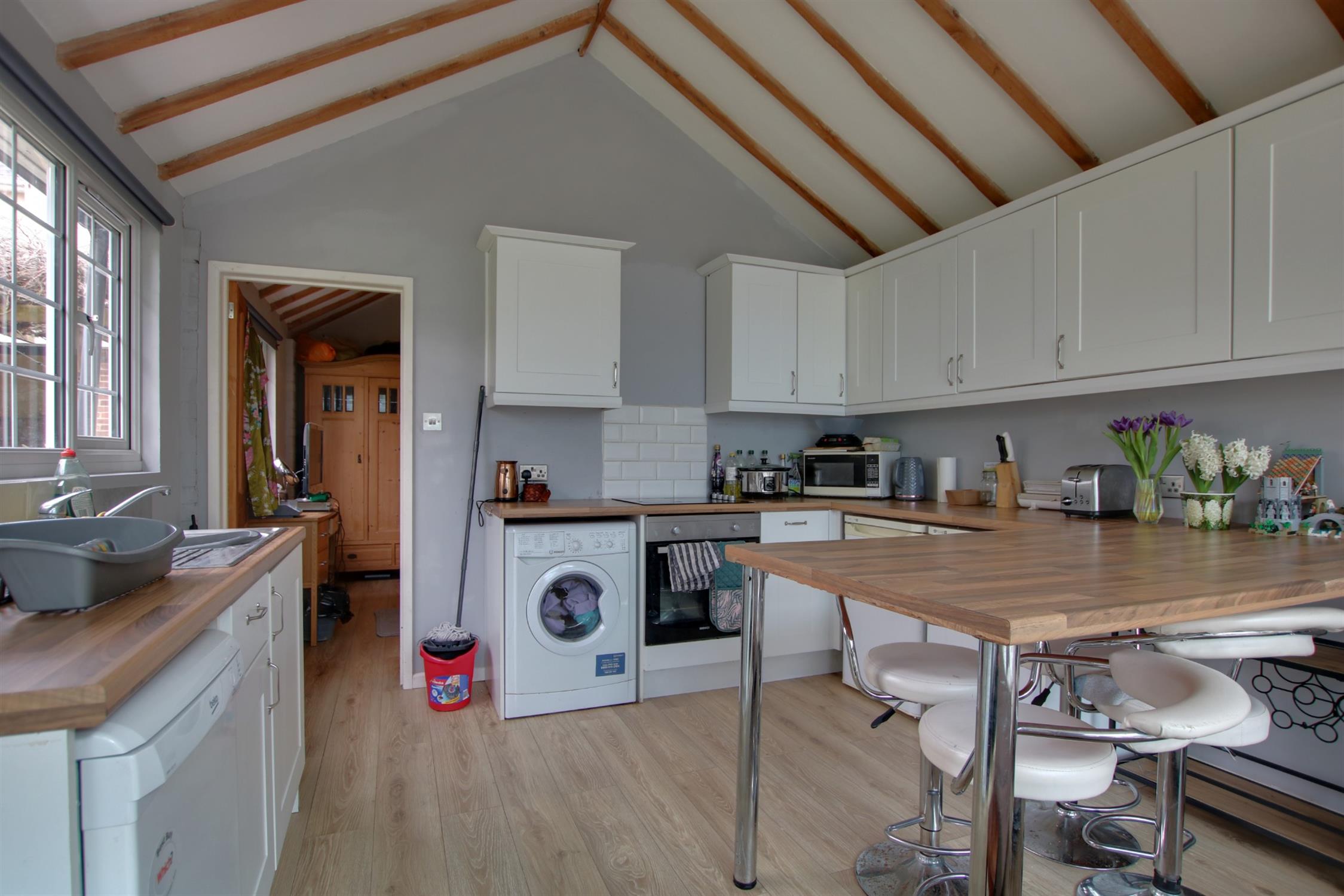 A comprehensive range of units to include built-in oven with hob and breakfast bar. Single drainer stainless steel sink unit with mono bloc mixer tap fitting. Wood effect flooring. Space for dishwasher and washing machine. Wall mounted electric heater. Open plan to:-