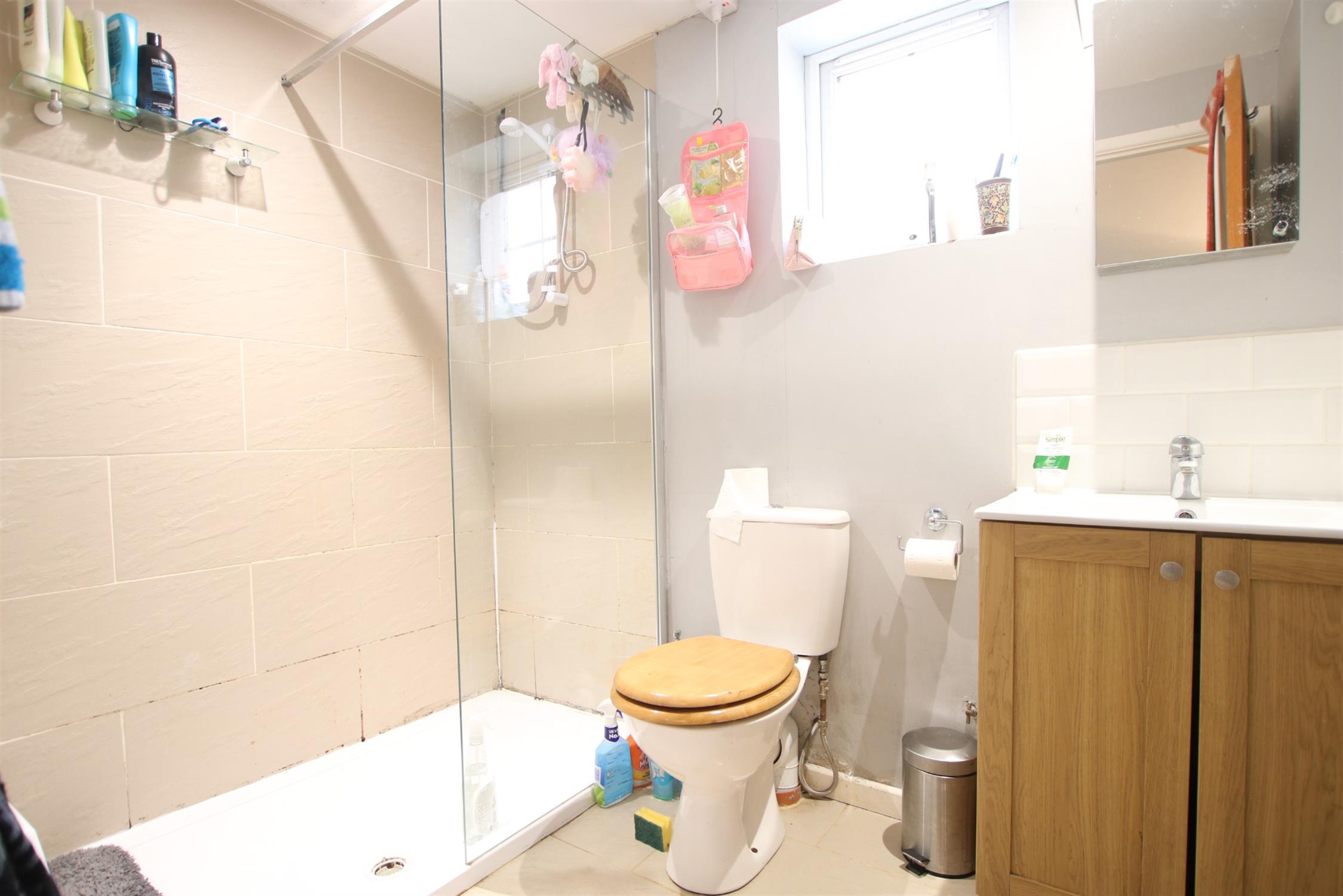 Over-sized walk-in shower with fixed screen, electric shower, low level w.c. and vanity hand basin. Chrome towel rail. Obscure double glazed window.
