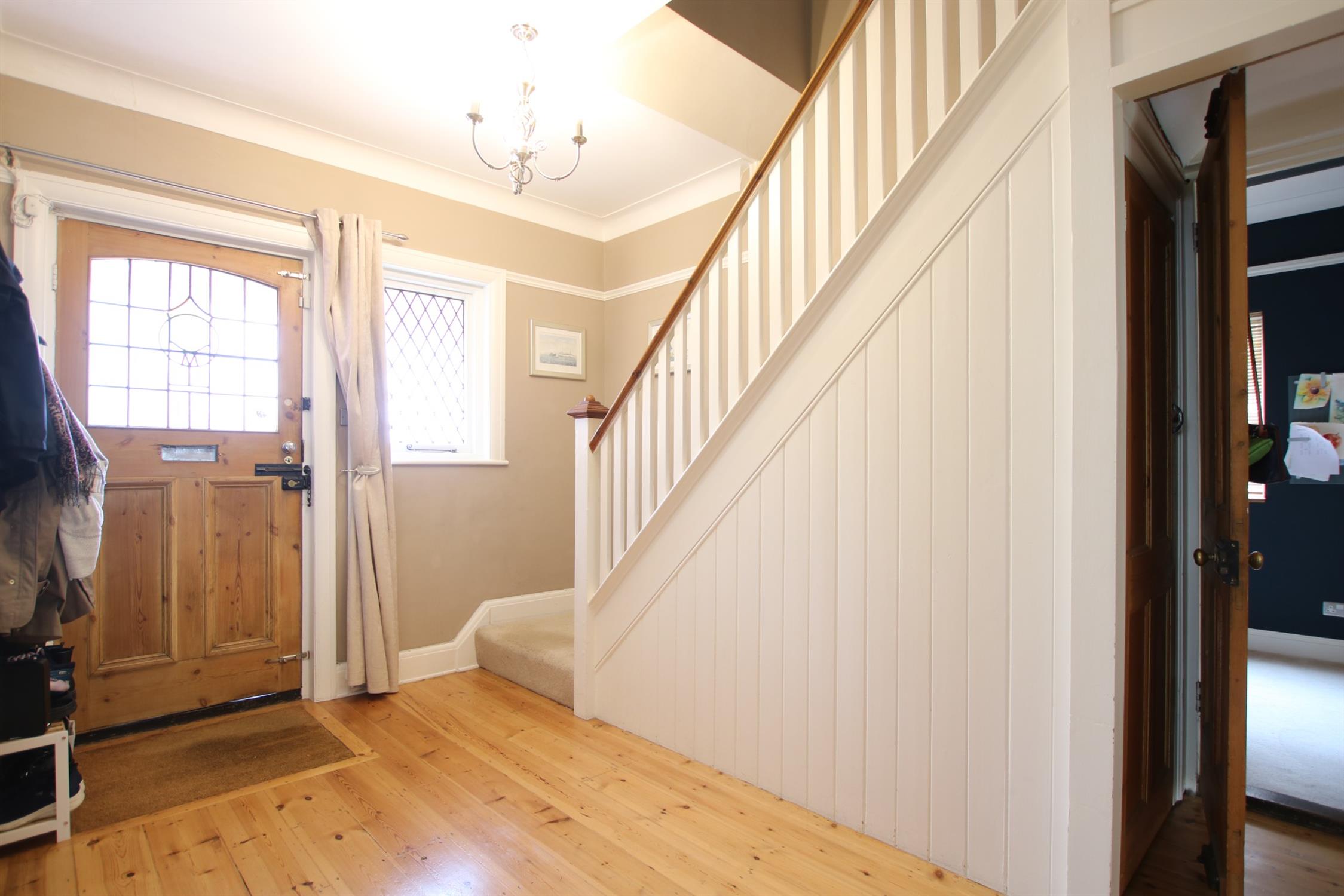 Entrance door with leaded light stained glass insert. Further leaded glazed window to front elevation. Period style radiator. Smooth plastered and coved ceiling. Wood flooring. Under stairs storage cupboard.