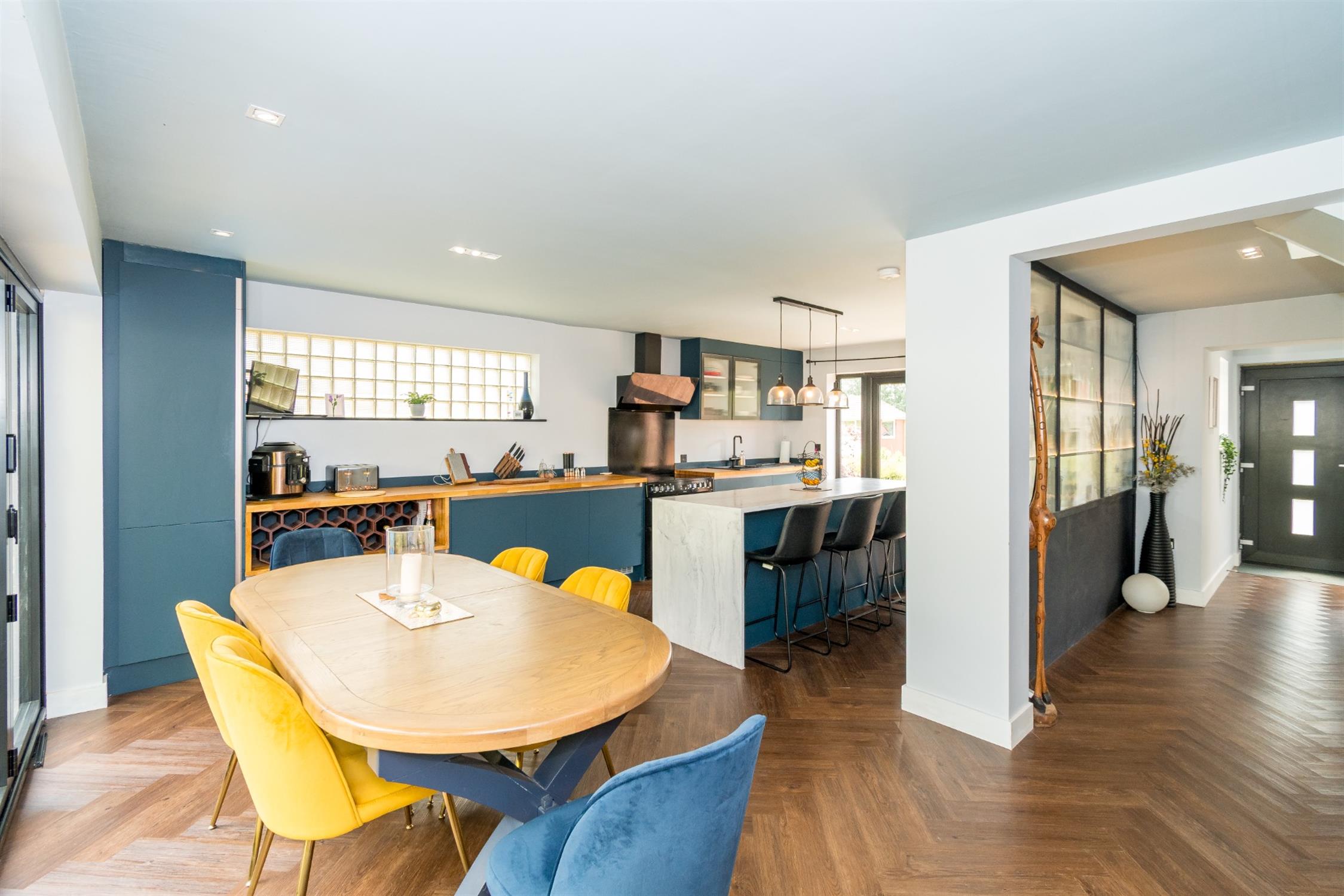 Double glazed French doors with double glazed side windows to front aspect. Smooth ceiling with recessed lighting. Single drainer one and a half bowl sink unit with mixer tap and cupboard under. A range of matching base mounted units with wood block work surface over. Integrated slim line dishwasher. Integrated under counter fridge and freezer. Space for range style oven with extractor over. Island unit with breakfast bar and quartz worktop. Laminate flooring. Bi-fold doors opening onto rear garden.