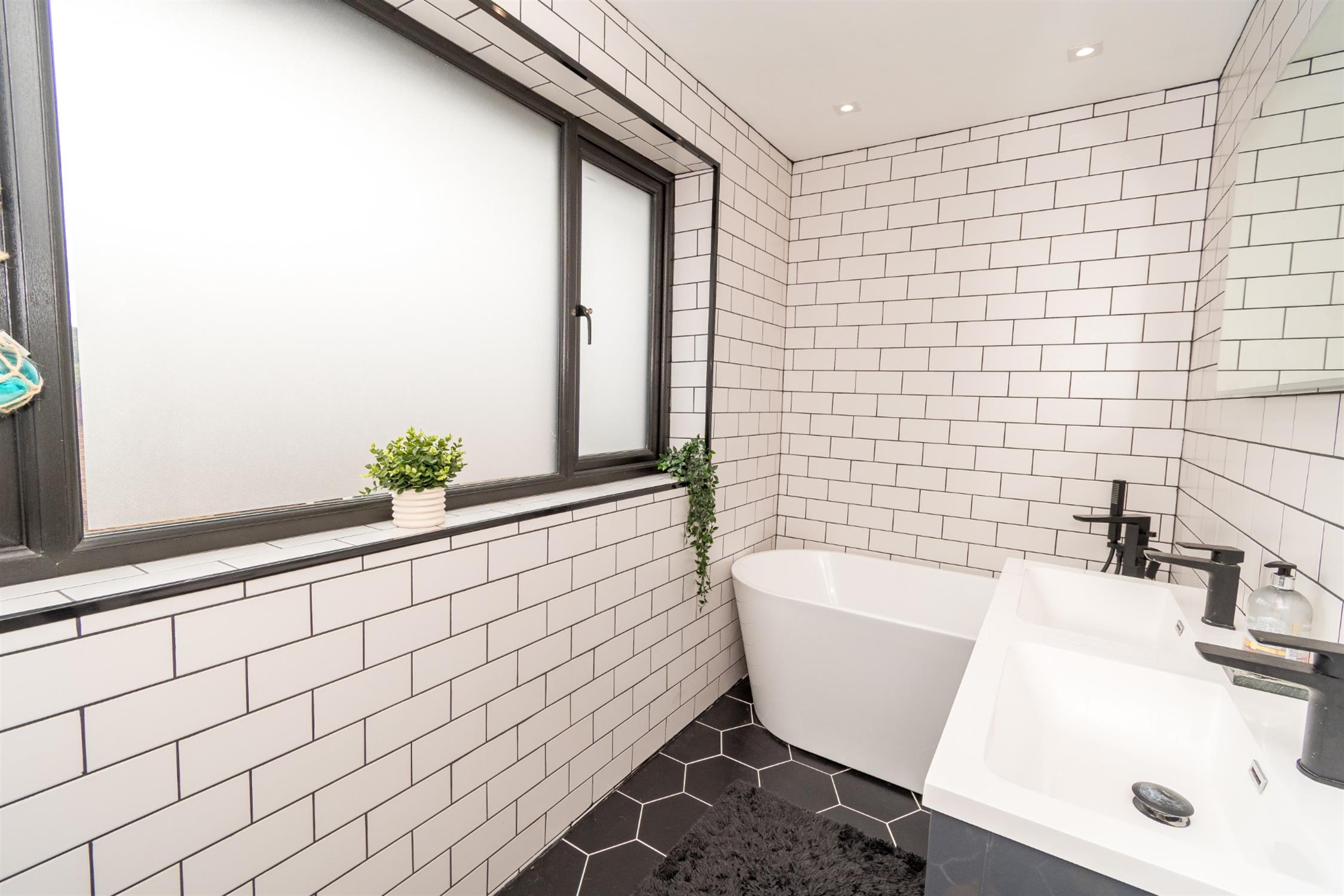 Double glazed obscure glass window to front aspect. Smooth ceiling with recessed lighting. Extractor. Oval free-standing bath with mixer tap and separate shower attachment, dual vanity wash basins with mixer tap and drawers under, tiled shower cubicle with rainfall shower head and separate shower attachment and concealed cistern w.c. Heated towel rail. Tiled walls. Tiled flooring.