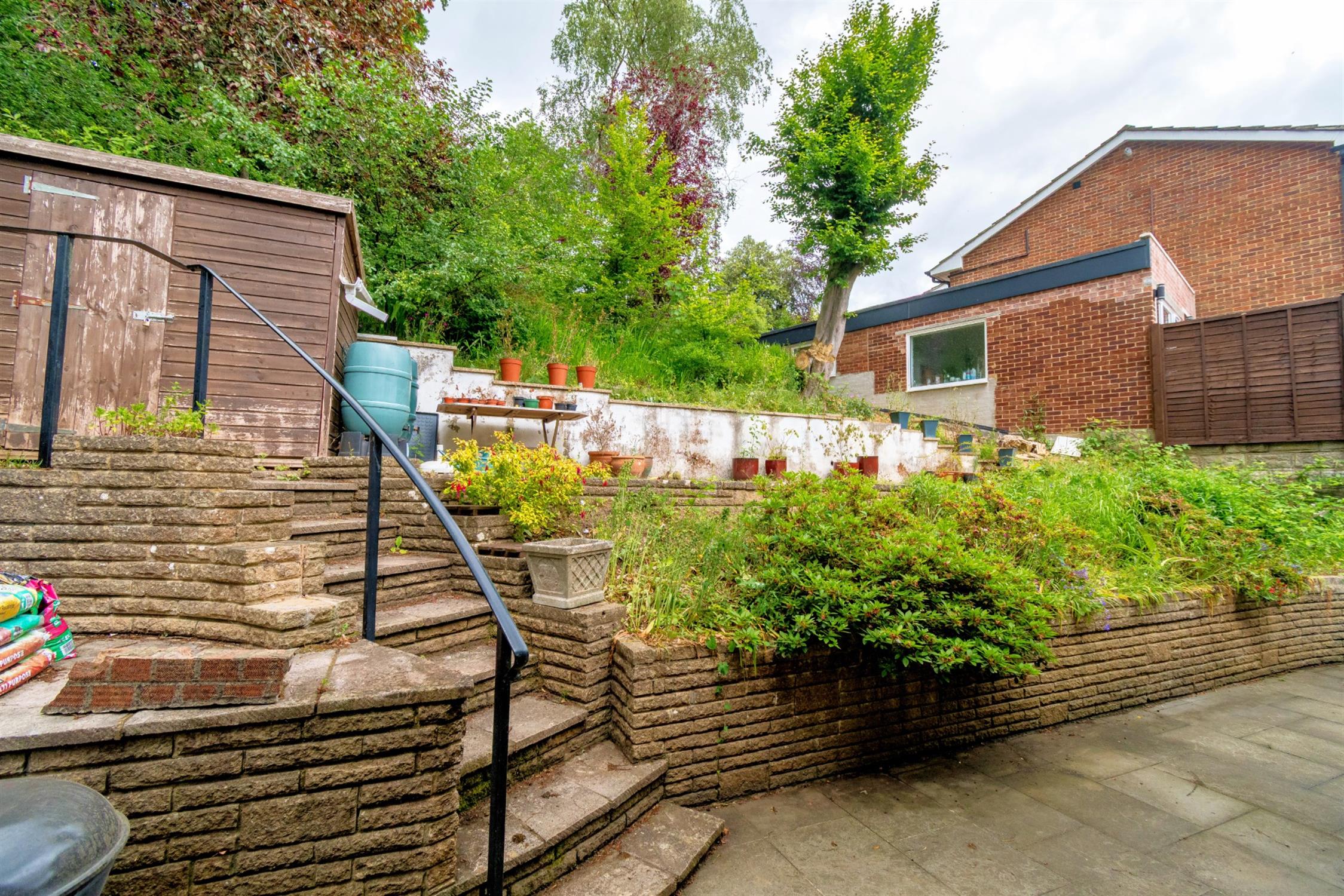 The rear garden has a substantial patio area with retaining wall giving access to a large well stocked planted area with hardy perennials. A stone stair case flight leads to a raised patio area with security hand railing with brick rendered finish stone retaining wall and a further external stair case with stone finish and security hand railing leading to the top tier. There is gated pedestrian access to the front, garden shed and outside tap.