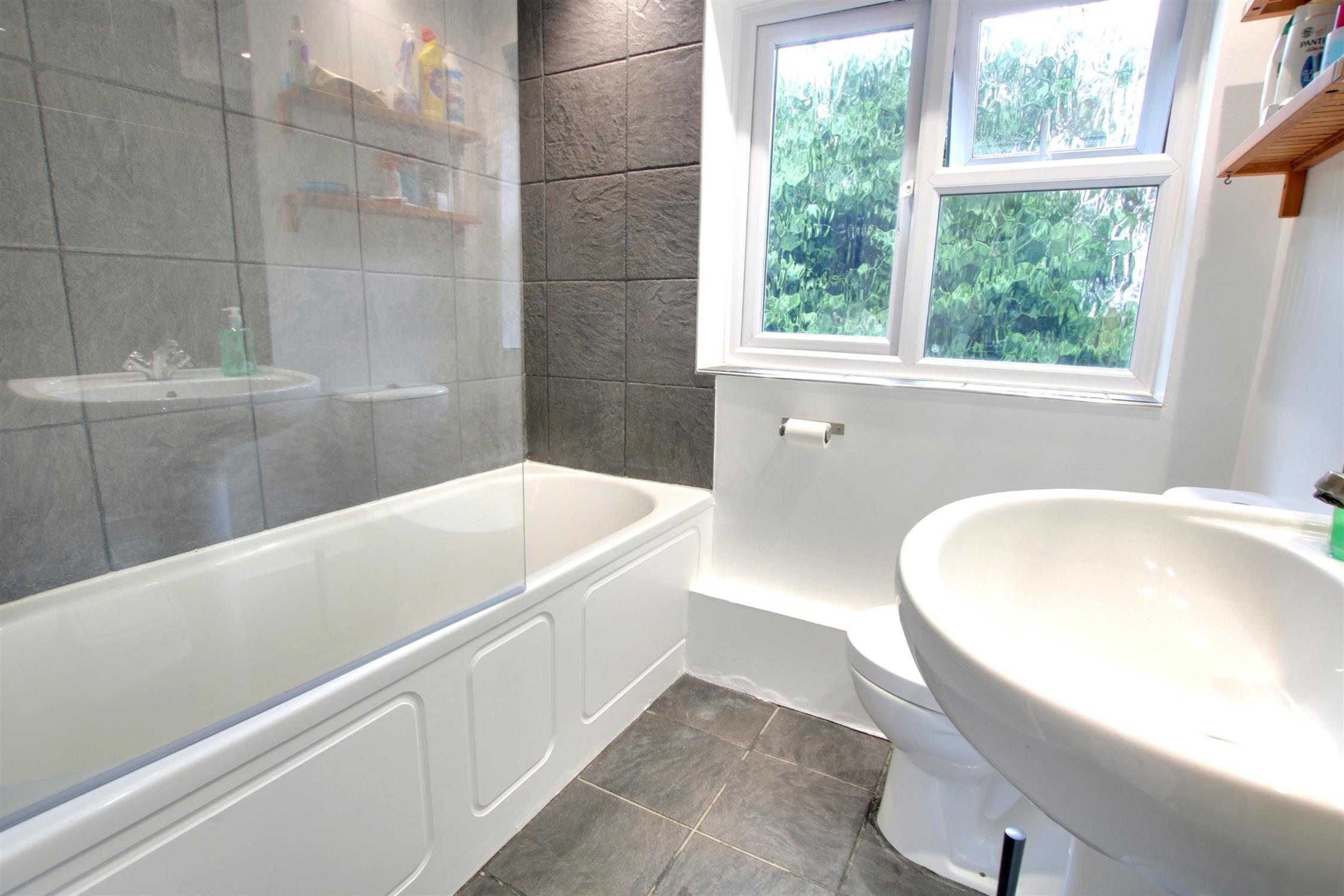 Contemporary suite comprising; tile enclosed panelled bath with shower screen and mixer tap fitting, pedestal wash hand basin and low level W.C. Obscure double-glazed window to rear elevation. Part tiled wall surfaces. Tiled flooring.