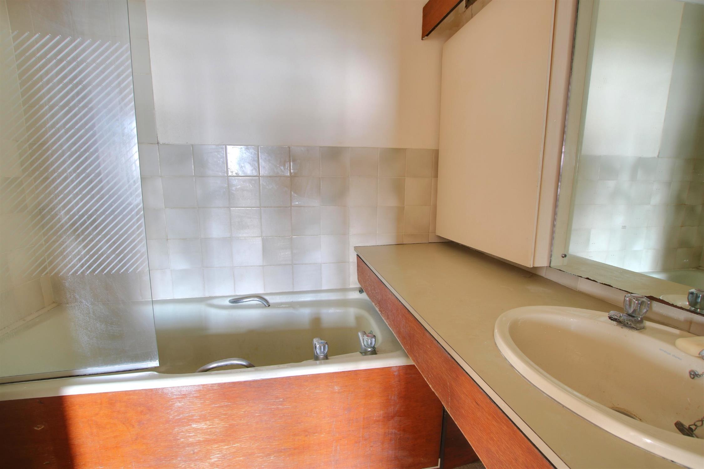 Panelled bath with screen and shower attachment and ceramic sink. Tiled walls.