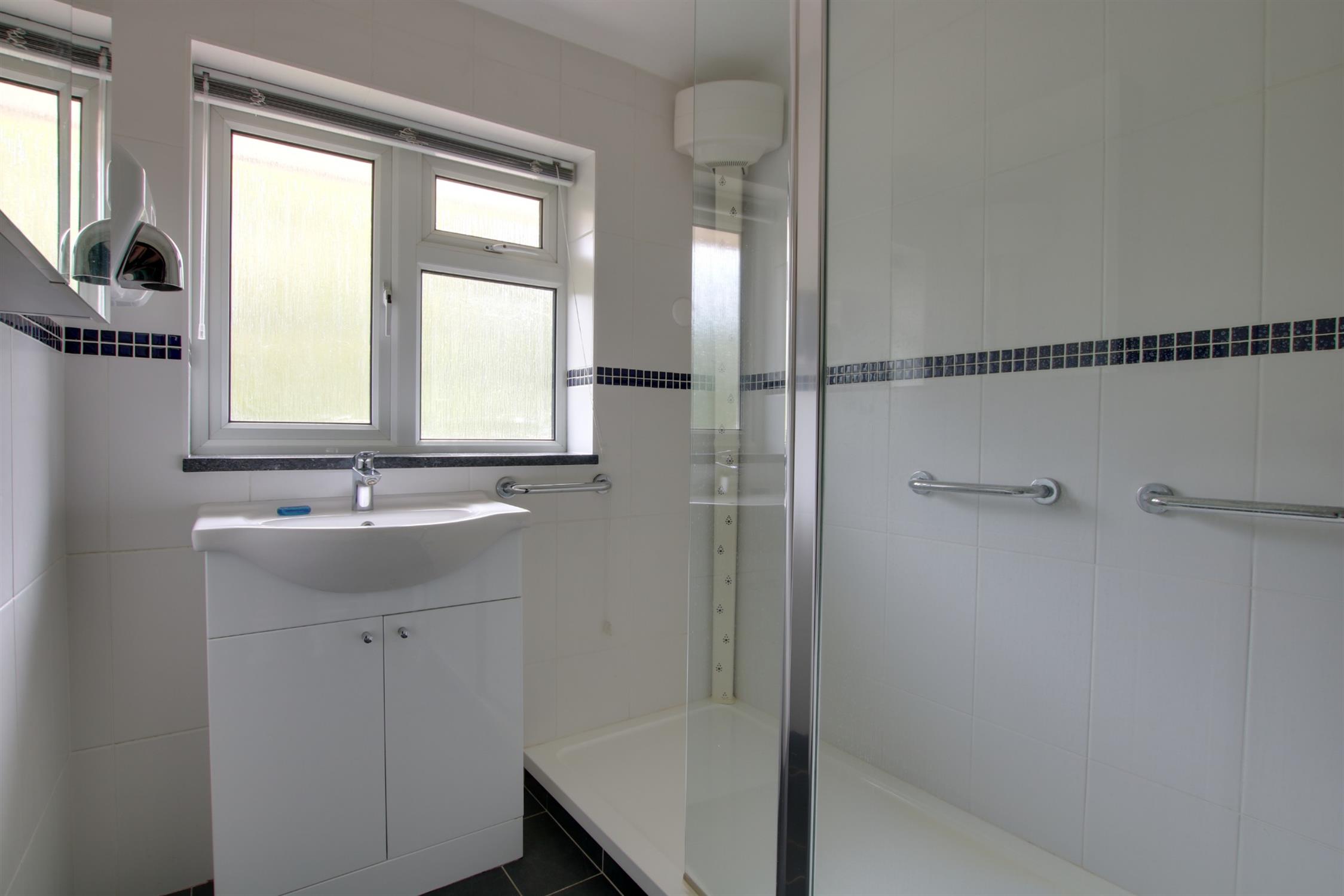 A re-fitted suite comprising; over-sized shower, vanity hand basin. Obscure double glazed window. Wall mounted hand dryer. Ladder style towel rail/radiator combination. Obscure double glazed window.