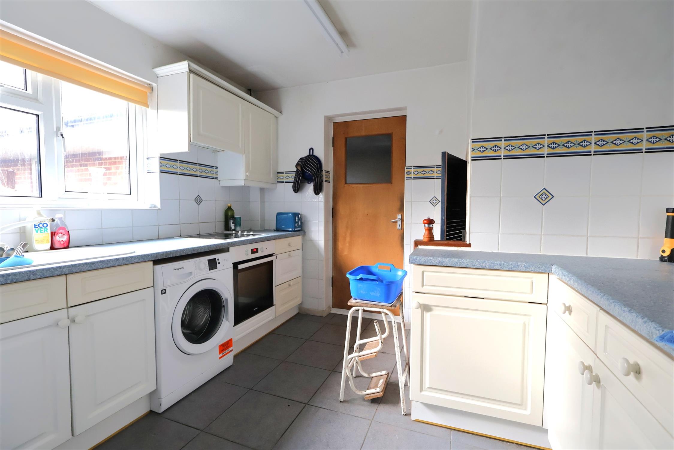 A fitted range of eye and base level units with one and a half bowl single drainer sink unit. Built-in oven with hob and extractor hood. Double glazed window to rear elevation. Tiled flooring. Wall mounted central heating boiler. Under stairs storage cupboard.
