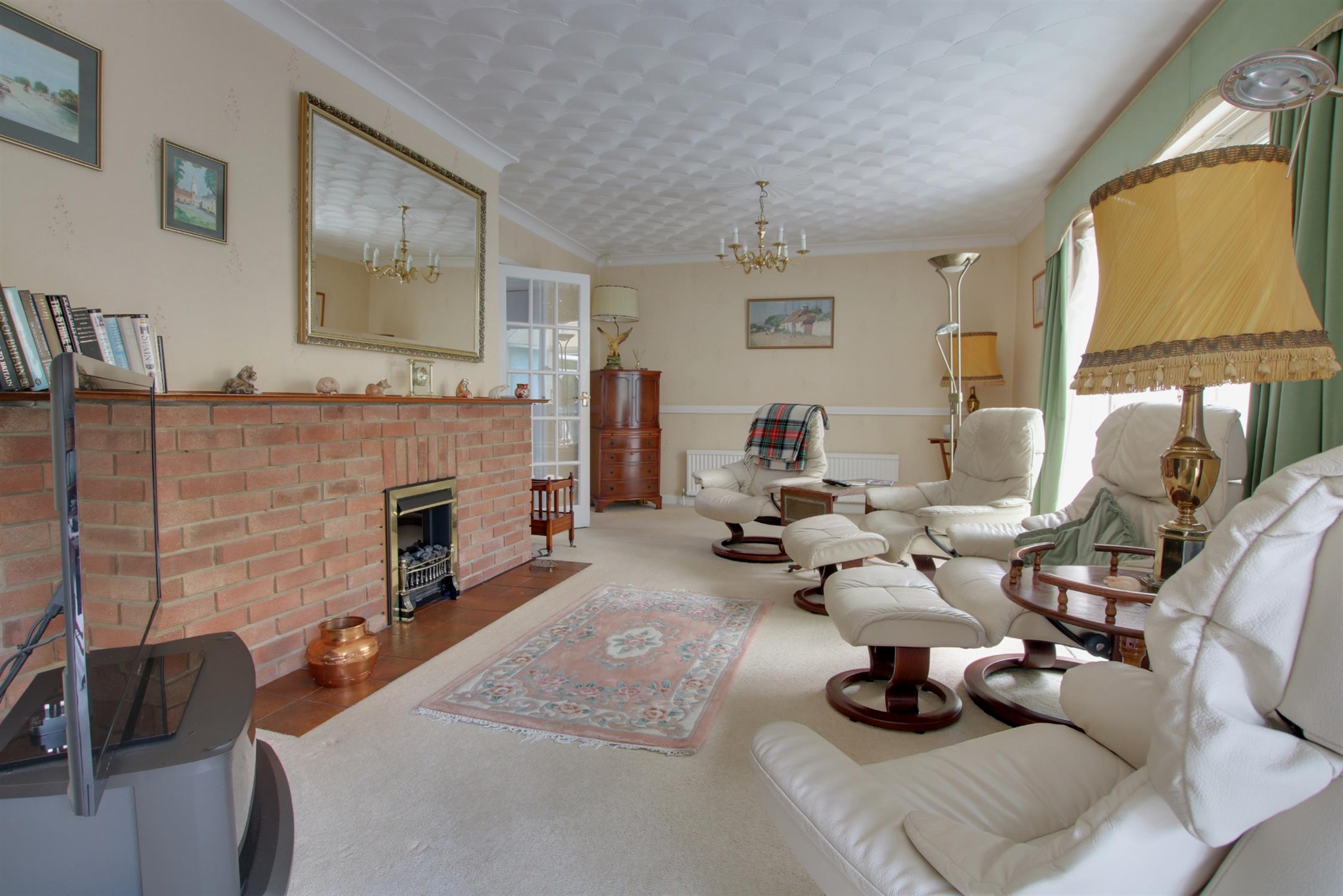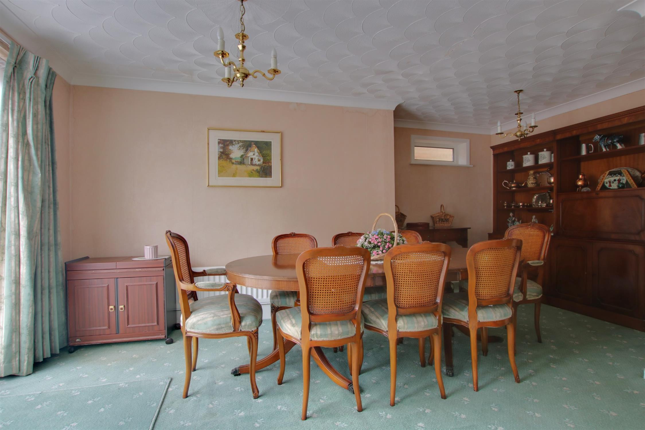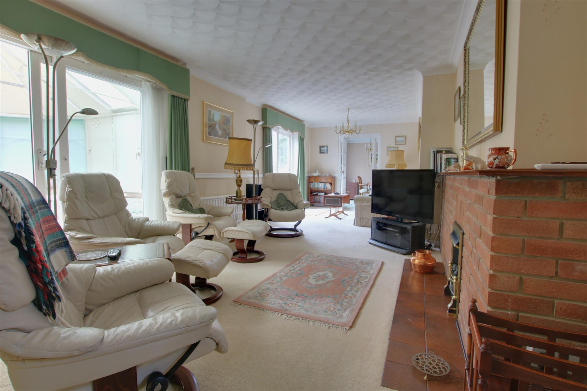 This impressively proportioned room centres on a brick fireplace with fitted electric fire. Two sets of patio double glazed doors leading to the rear elevation. Two radiators. Dado railing. Coved ceiling. Georgian style internal door leading to:-