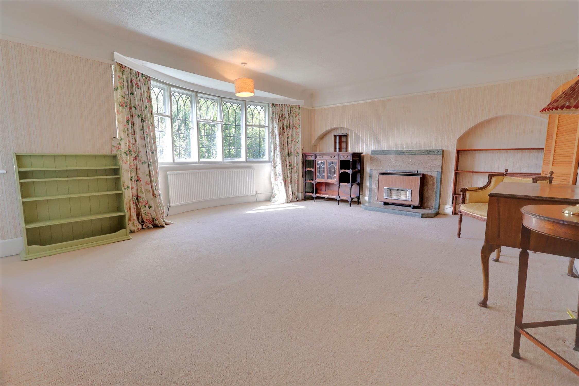 Impressive secondary leaded double glazed bay window to front elevation. Two wall light points. Curved radiator. Further radiator. Stone fireplace. Smooth plastered and coved ceiling.