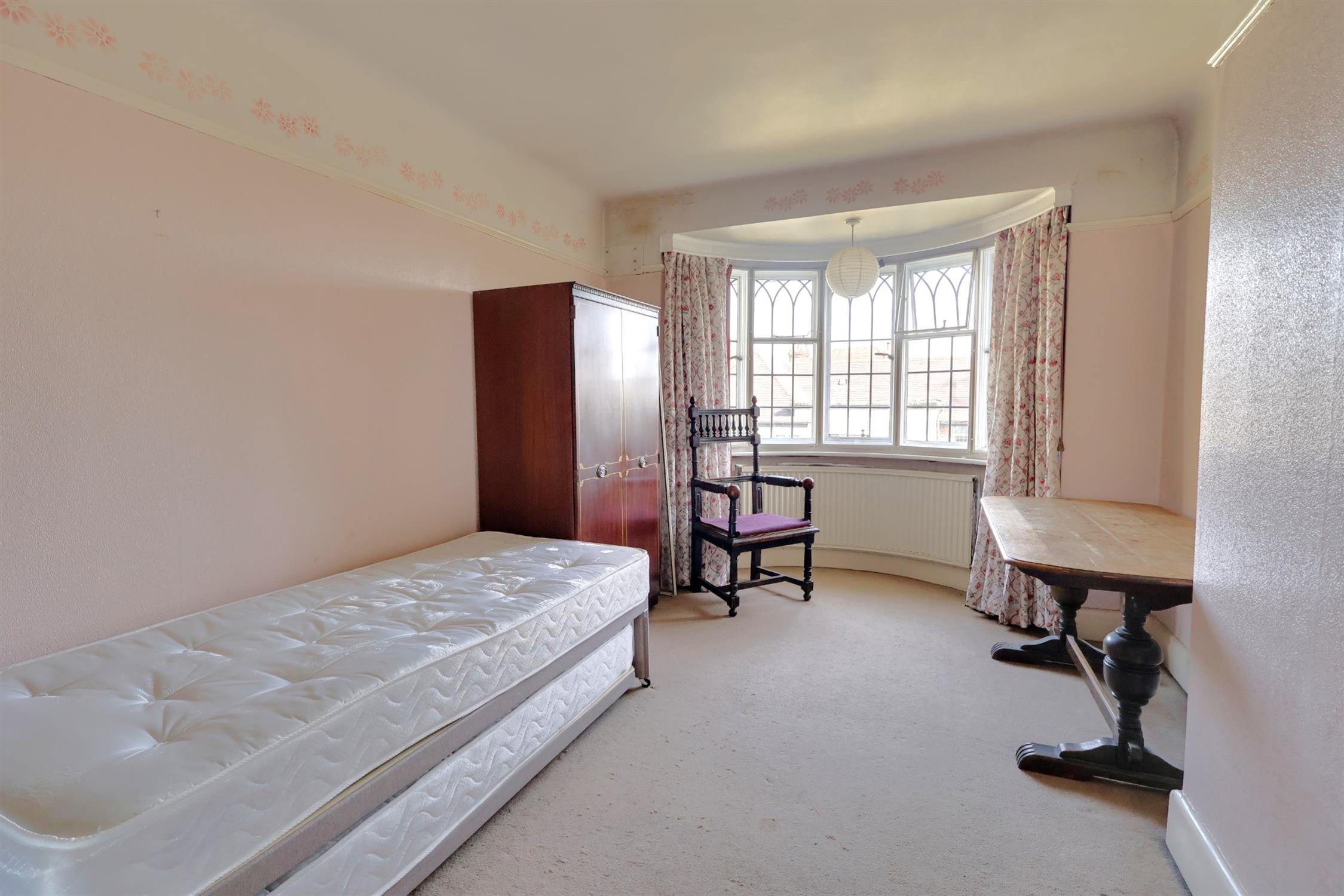 A dual aspect room with leaded secondary double glazed bay window. Further additional leaded double glazed window. Curved radiator. Further additional radiator. Built-in wardrobe providing hanging and shelf storage.