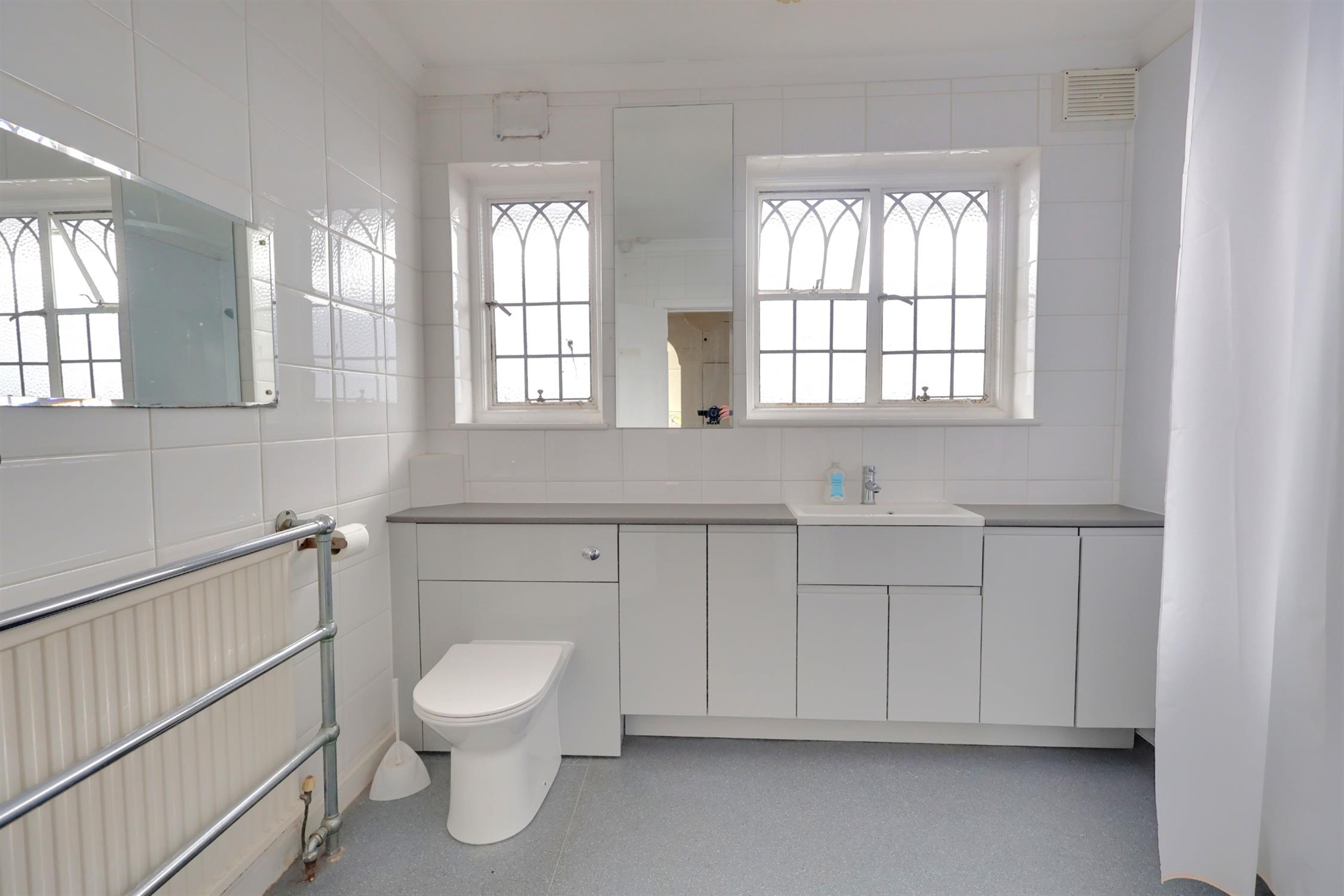 Low level w.c. and vanity hand basin. Secondary leaded double glazed window. Radiator. High level built-in storage cupboards. Extractor fan.