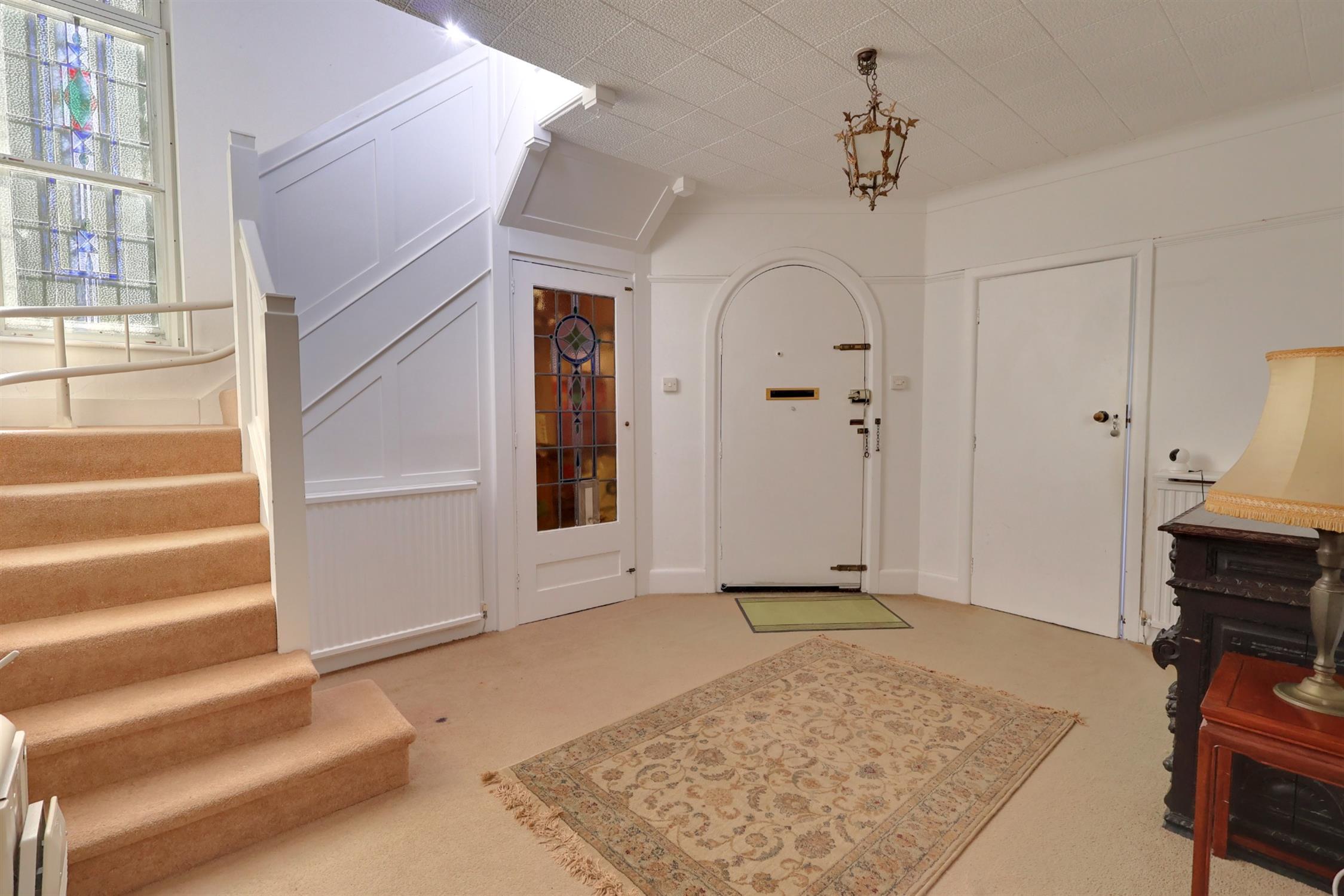 The grand reception hallway offers a welcoming and spacious entrance to this home benefitting from a double height and a period curved top entrance door with natural light provided by a feature leaded light stained glass window to the side elevation. Stairs rising to the first floor landing. Under stairs storage cupboard which includes a window to the side elevation. Radiator. Picture railing.