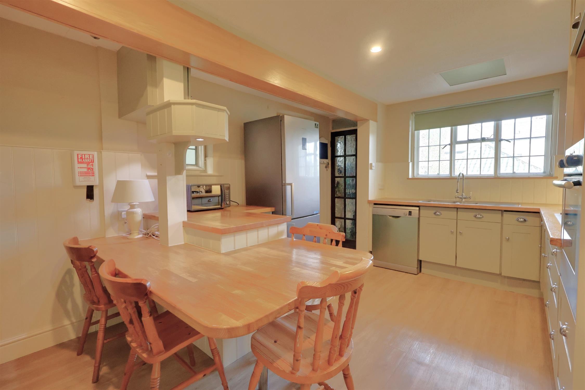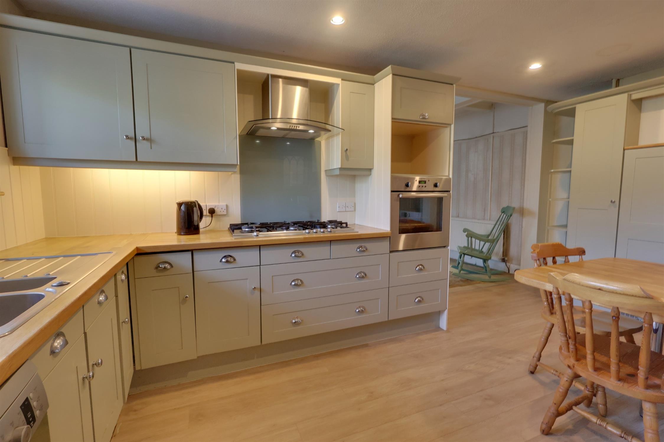 A comprehensive range of eye and base level units to include a one and a half bowl single drainer stainless steel sink unit. Built-in oven as well as five burner gas hob. Stainless steel and glass finished chimney style extractor. Suitable space for dishwasher. Built-in dining bar and built-in drying cupboard with additional radiator. Three leaded secondary double glazed windows, two to side and one to rear elevation. Partial wood panelling. Further door to side elevation. Laundry Cupboard - suitable space and plumbing for automatic washing machine. Wall mounted central heating boiler. Leaded secondary double glazed window.