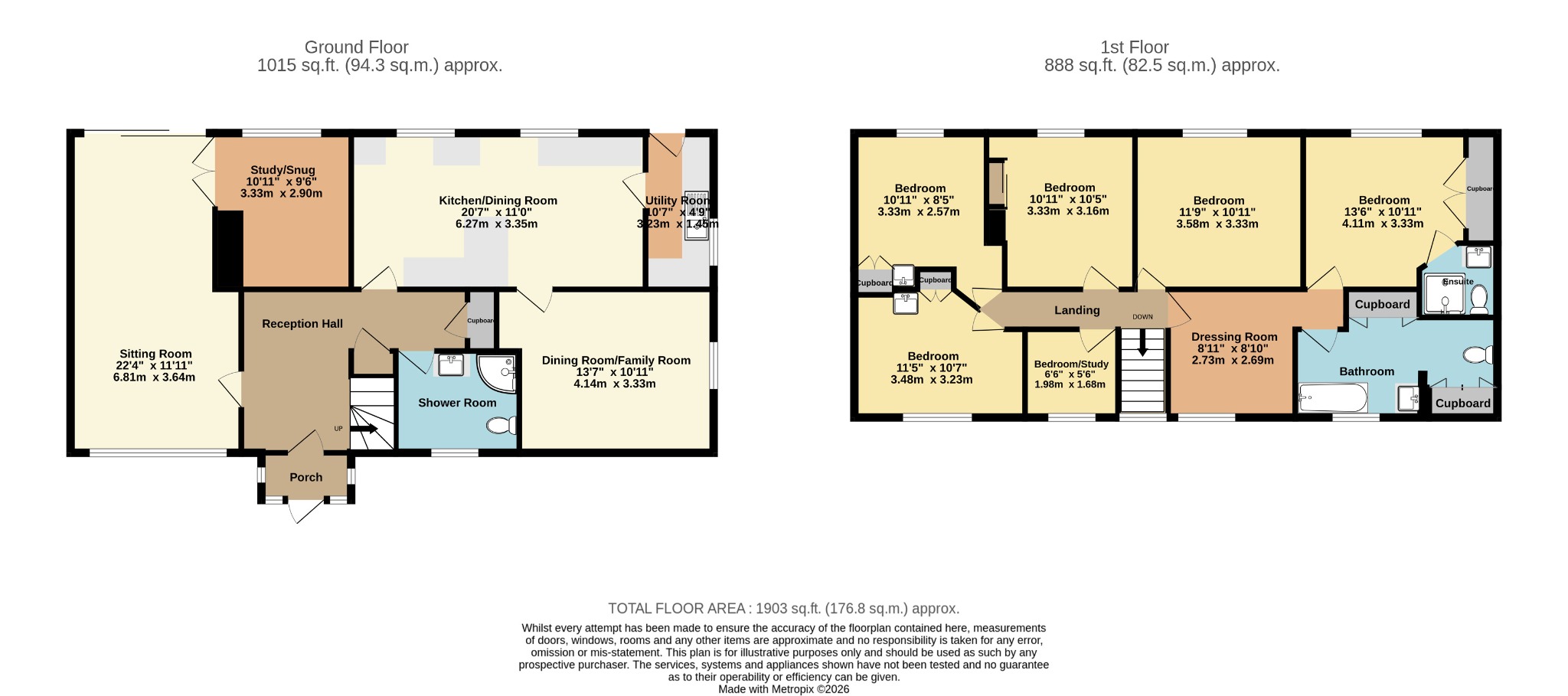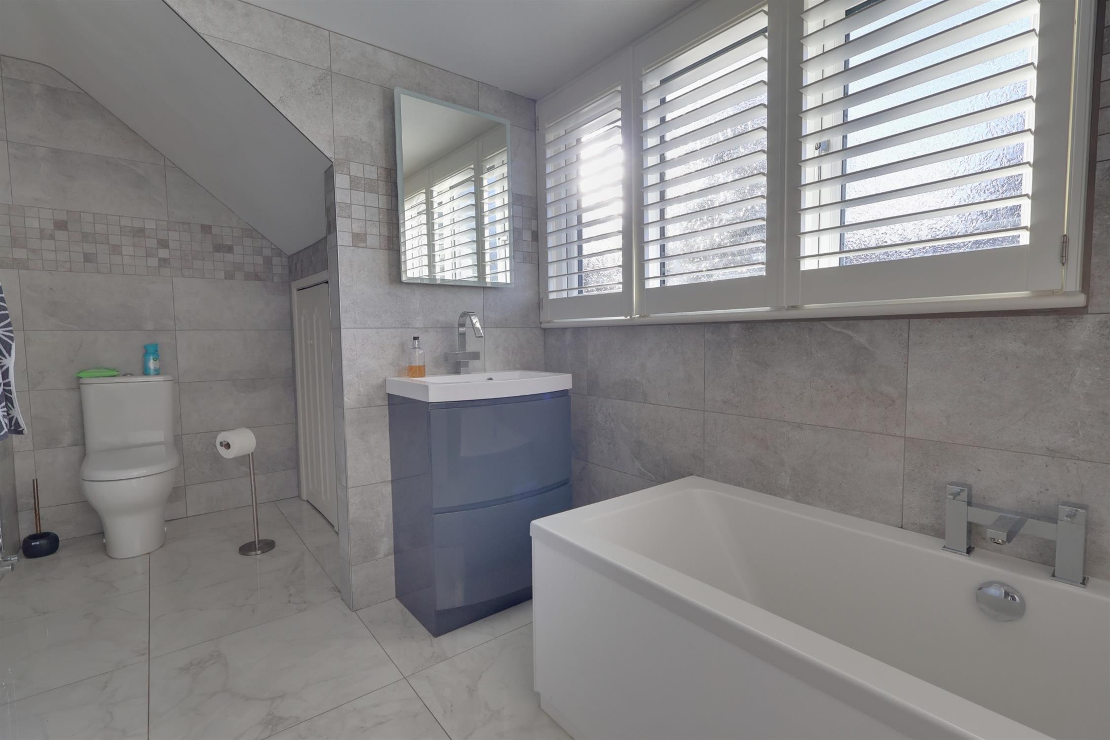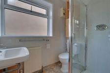 Contemporary three piece comprising; shower cubicle, low level w.c. and pedestal wash hand basin. Obscure double-glazed window. Tiled floors and wall surfaces. Extractor fan. Access to loft space which is boarded and has a pull-down loft ladder