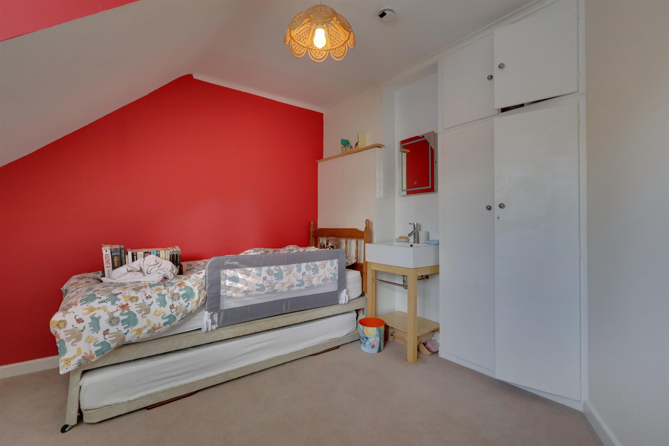 Double glazed window. Radiator. Access to eaves storage. Smooth plastered ceiling. Wash stand with hand basin. Built-in cupboard.