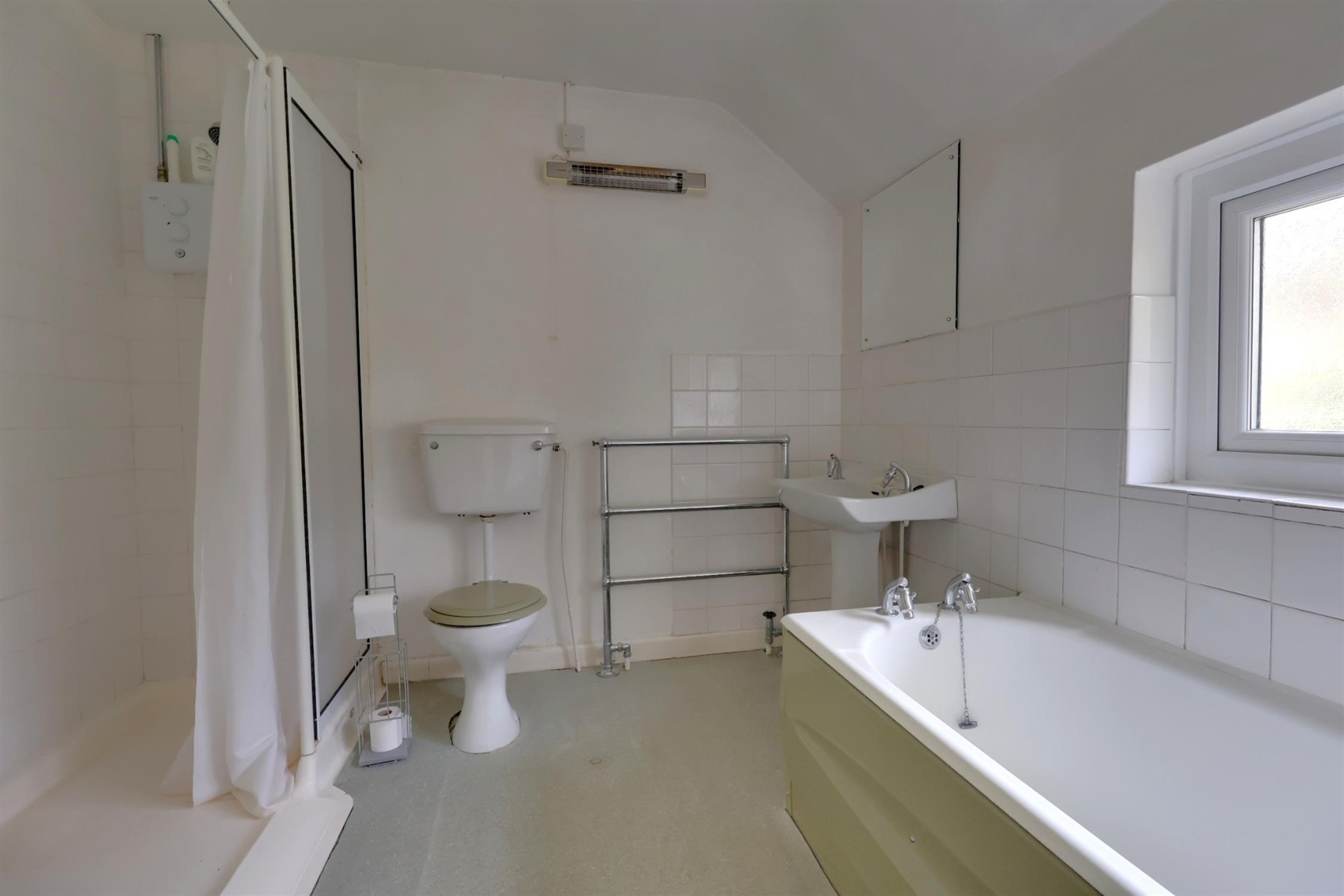 Four piece suite comprising; walk-in shower, panelled bath, pedestal wash hand basin and low level w.c. Obscure double glazed window. Partly tiled wall surfaces. Heated towel rail. Smooth plastered ceiling.