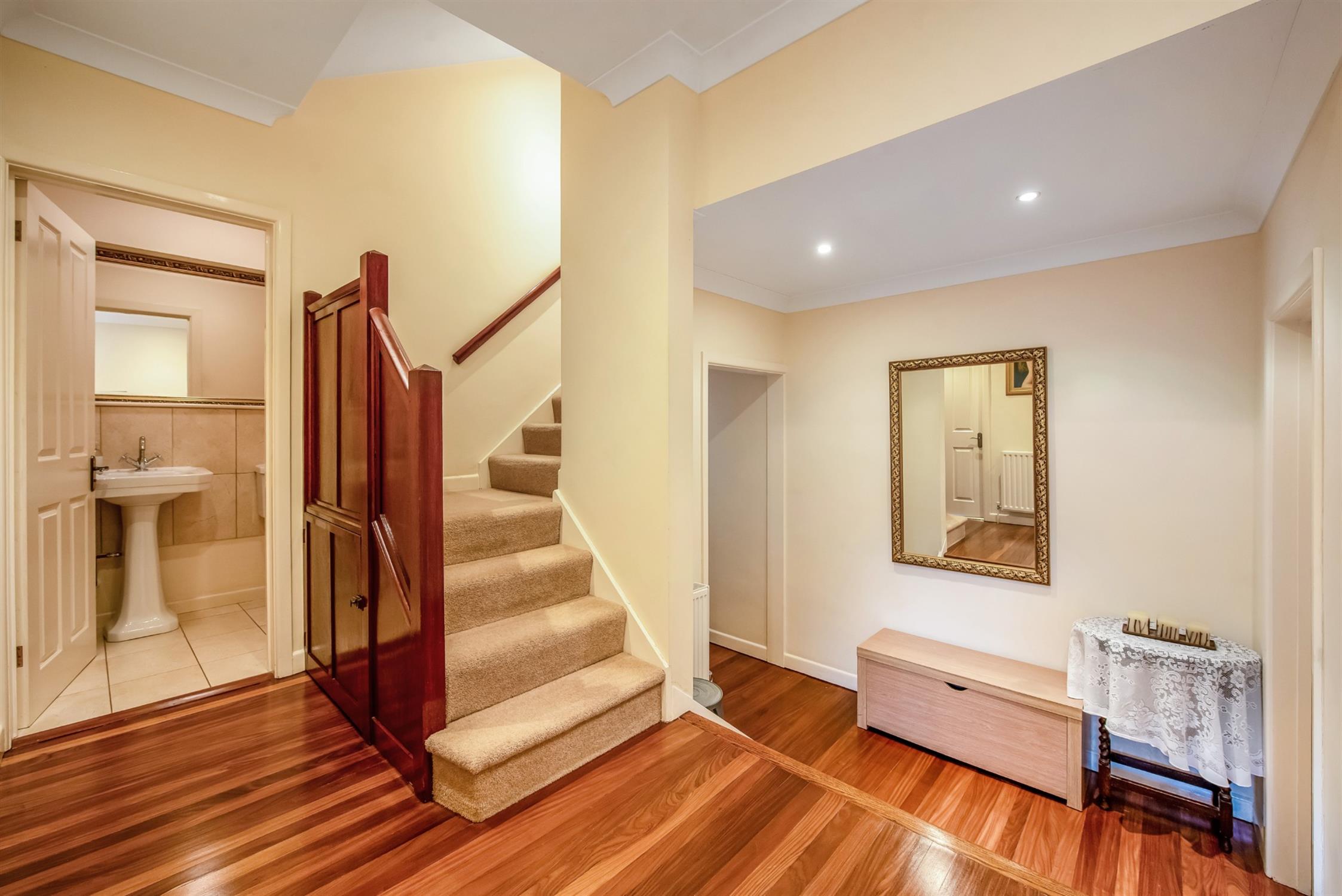 Double glazed entrance door. Split level with steps leading down to the principal accommodation. Two radiators. Stairs rising to first floor landing. Smooth plastered and coved ceiling with recessed lighting. Two under stairs storage cupboards. Narrow strip wood flooring.
