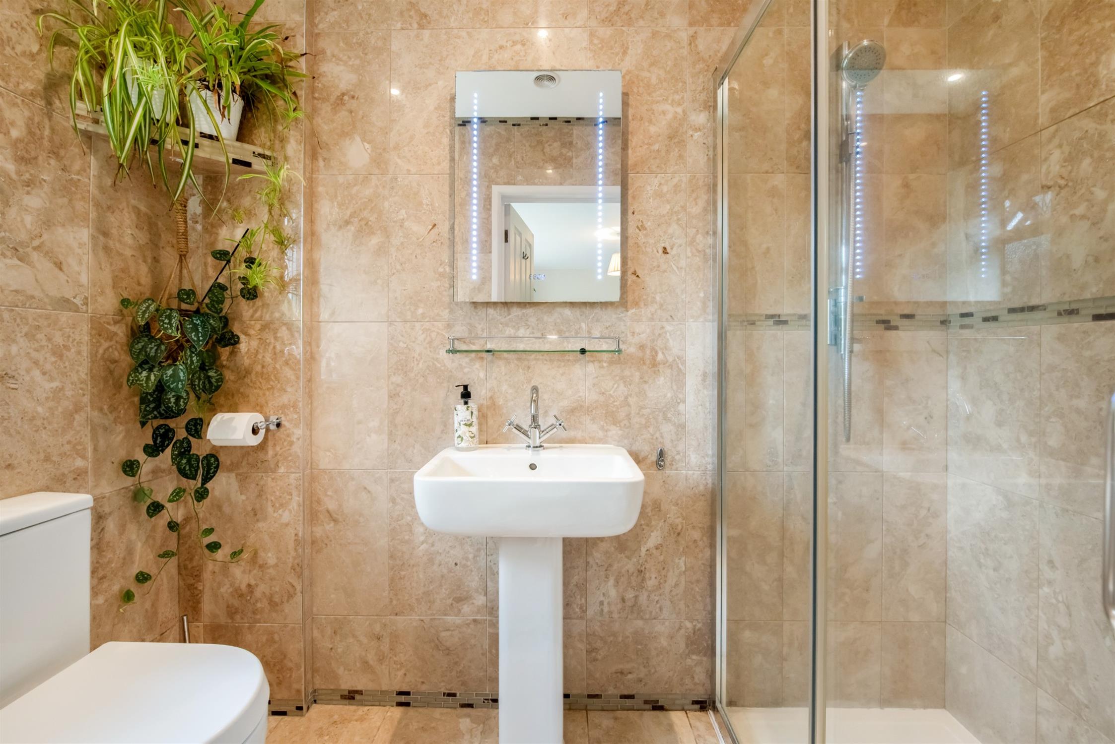 Re-fitted suite comprising; one and a half width shower, low level w.c. and pedestal wash hand basin. Tiled wall and floor surfaces. Smooth plastered ceiling with recessed lighting. Obscure double glazed window. Extractor fan. Radiator.