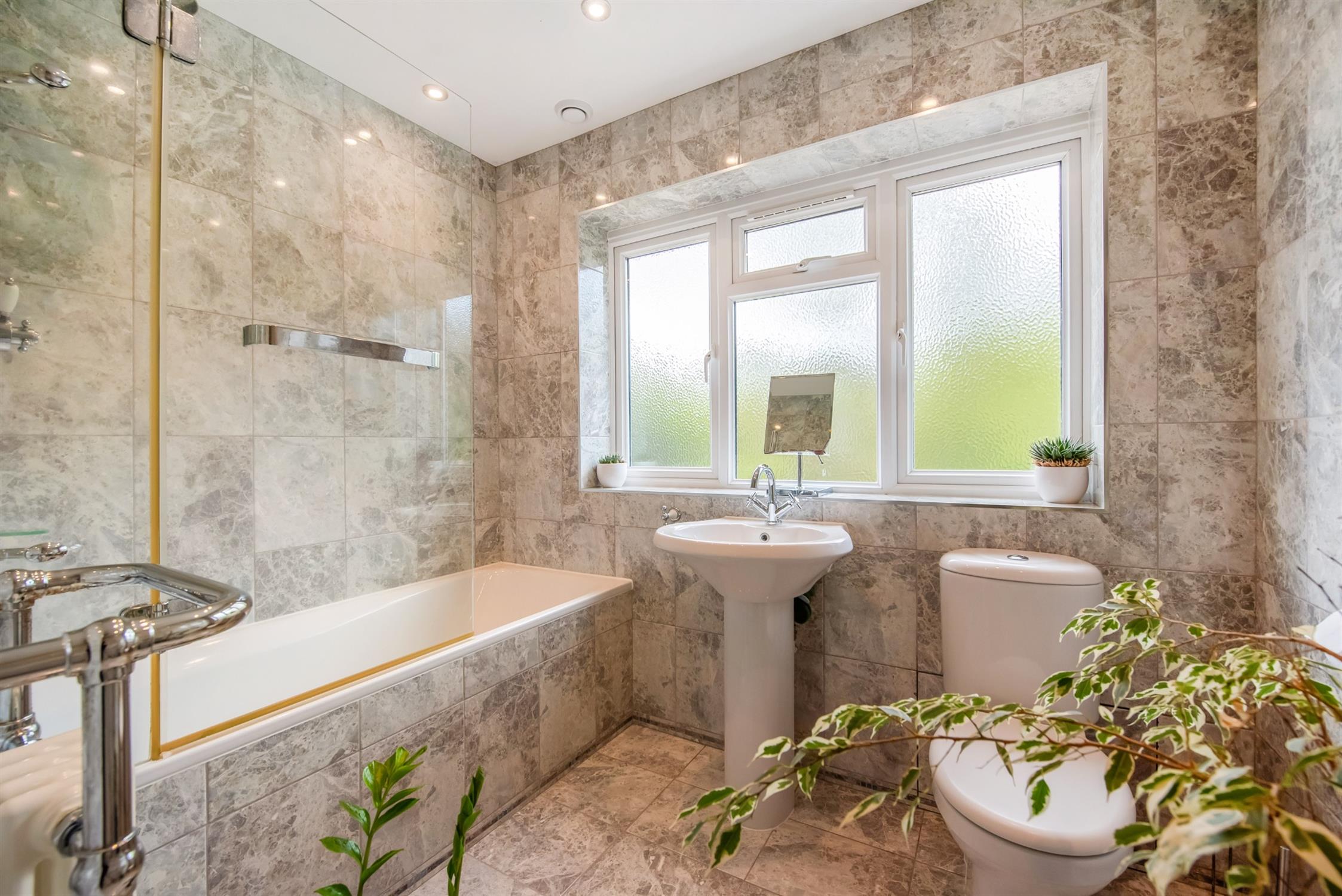 Re-fitted suite comprising; panelled bath with rainfall style shower over, pedestal wash hand basin and low level w.c. Radiator/towel rail. Obscure double glazed window. Extractor fan. Recessed lighting. Tiled floor surfaces.