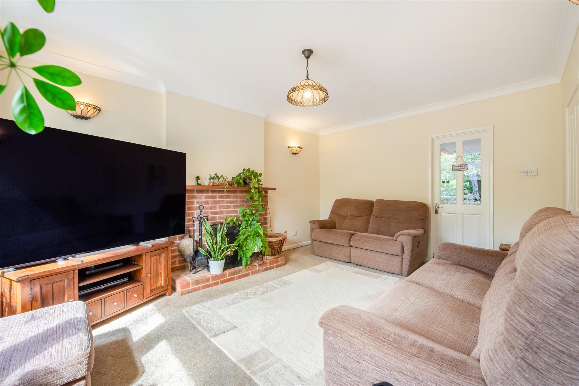 Double glazed door and window to rear elevation. Smooth plastered and coved ceiling. Radiator. Three wall light points. Feature brick fireplace with open working fire.