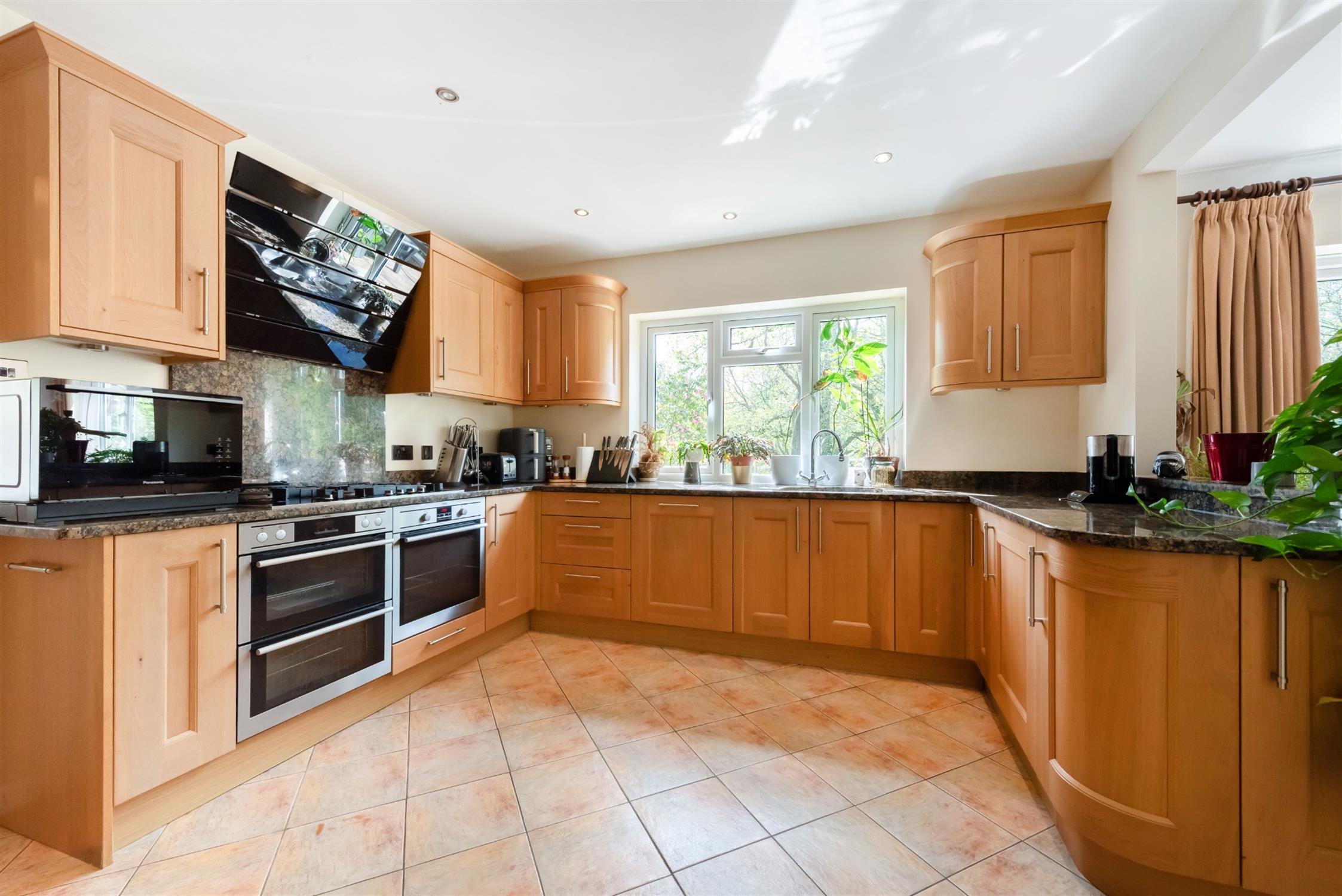 Open plan from the dining area. Comprehensively re-fitted with a range of eye and base level units trimmed with granite work surfaces and underlaid one and a half bowl sink with integrated drainer and mixer tap fitting. Matching granite up-stands. Twin AEG ovens with fitted five burner gas hob and externally vented extractor hood. Miele dishwasher. Fitted fruit and vegetable basket drawers. Smooth plastered ceiling with recessed lighting. Tiled flooring. Downlighters to worktop surfaces. Pantry style cupboard.