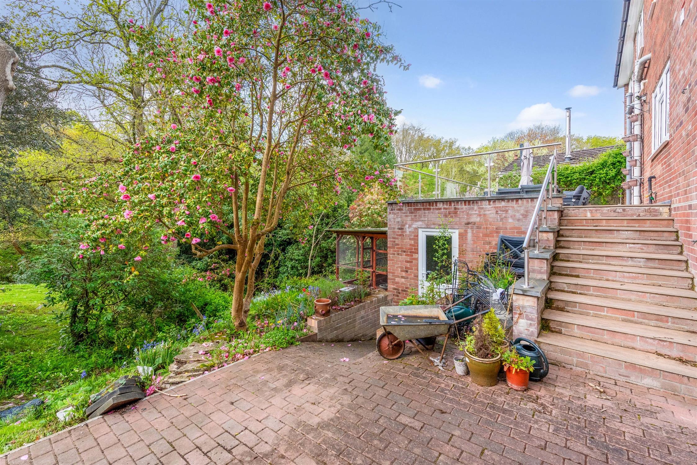 Beneath the terrace is a substantial garden store which measures an impressive 29' 4" x 14' 10" and provides the perfect space for storage of recreational and garden equipment as well as many other potential uses such as a home office or gym. This room is externally accessed and benefits from a double glazed window and door with power and light available as well as fluorescent strip lighting. The gardens are approached via block paviour pathway and in addition there is a detached timber shed as well as barbecue patio area. The approach to the terrace is finished in a wood effect stone and there is outside lighting, power and water facilities available. Some of the lighting is operated on a sensor controlled system as well as manually operated within the house. The gardens of this home are a particular feature with a huge range and variety of flowers, shrubs and trees to include cherry blossom as well as fruit bearing trees. Some of the gardens are left to a wild style with a large proportion being laid to lawn. Gated access onto the woodlands to the rear and only a personal inspection will afford any potential purchasers to truly appreciate the tranquility and peace as well as size and aspect that these gardens have to offer.