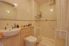 Low level close coupled WC with enclosed cistern. Wash hand basin with cupboard under. Walk in shower cubicle with electric shower. Extractor fan. Electric shaver light. Tiled walls.