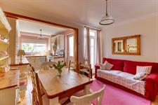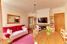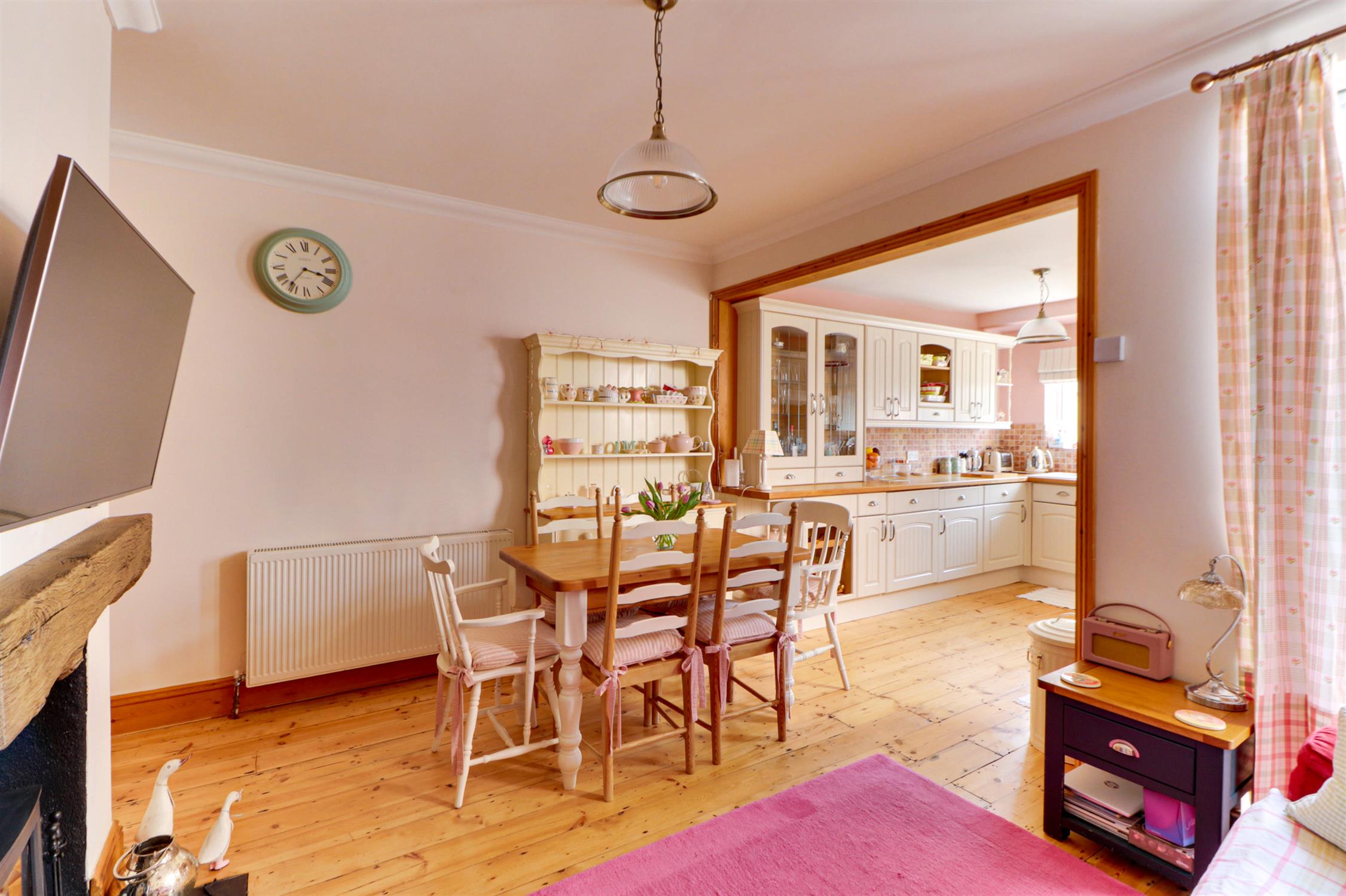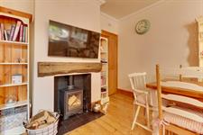 Smooth ceiling, double-glazed double doors to rear garden, multi-fuel burner set on tiled hearth, under stairs storage cupboard, opening through to kitchen and stripped wooden floorboards.