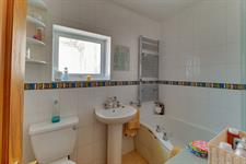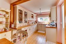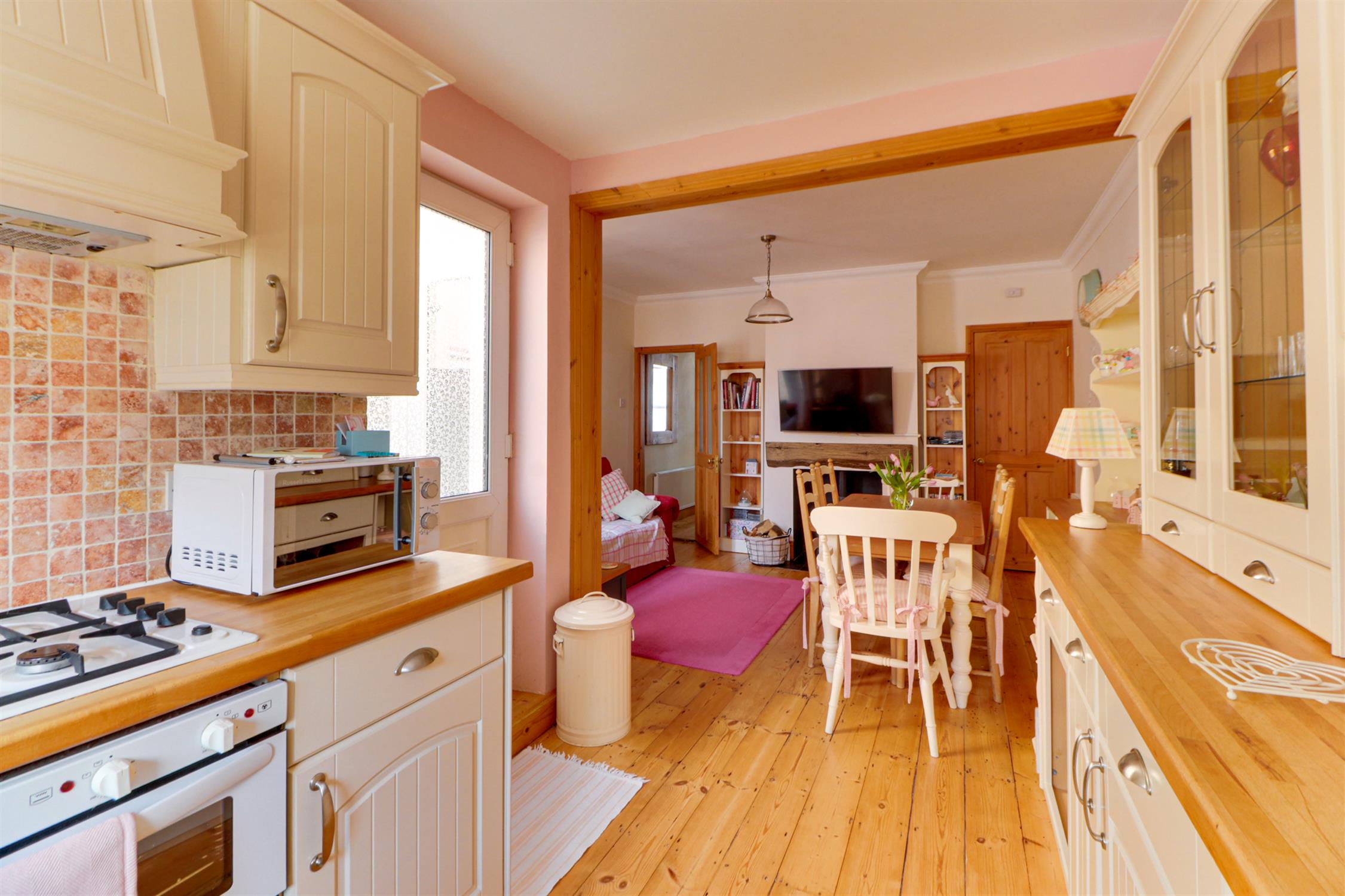 Smooth ceiling, double-glazed rear aspect window, double-glazed side door to rear garden, a range of wall and base-mounted units with roll top work surfaces over and inset one and a half bowl sink and drainer with mixer tap over. Integrated electric oven and gas hob with extractor fan over, integrated washing machine and dishwasher. Integrated fridge and freezer. Part tiled walls and stripped wooden floor boards.