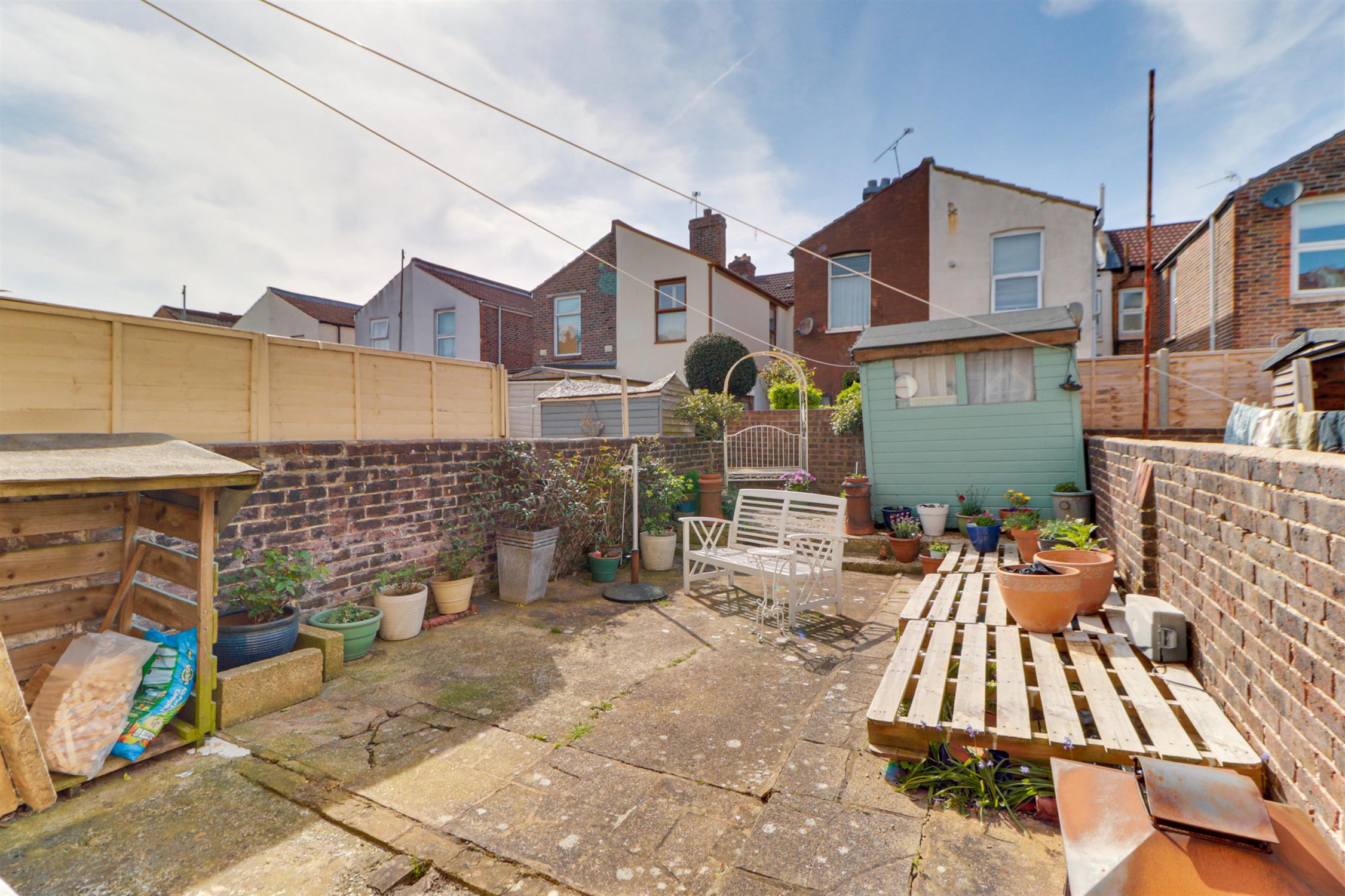 The rear garden is mostly laid to patio with shrub and flower borders, brick wall enclosed and wooden storage shed.