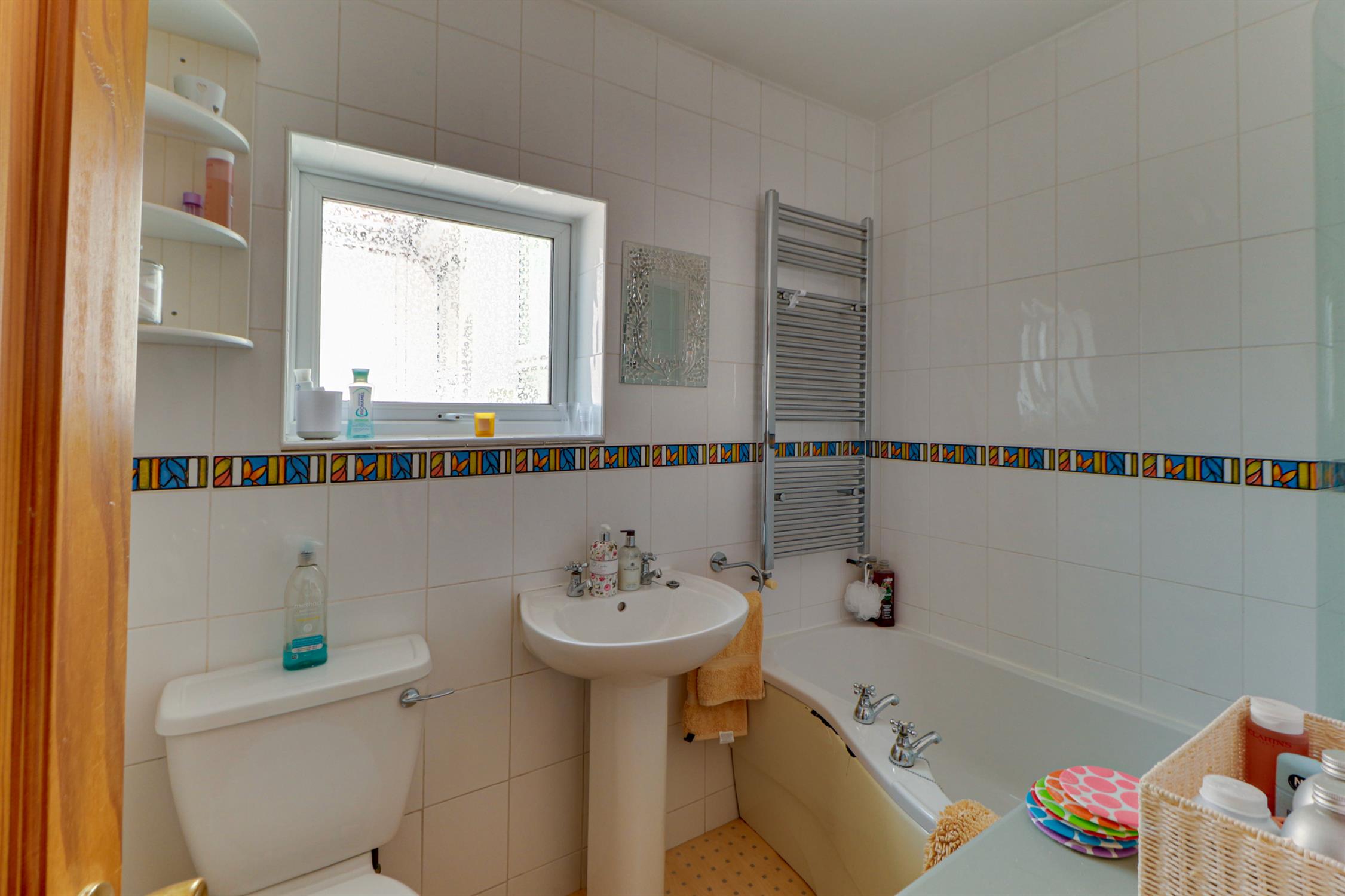 Smooth ceiling, double-glazed obscure window, 'P' shaped bath with shower over and glass screen, low level WC, pedestal wash hand basin, tiled walls, vinyl flooring and ladder radiator.