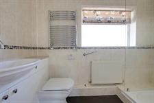 Double glazed window to side elevation. Walk-in double shower cubicle with wall mounted shower unit. Low level close coupled WC. Vanity unit with wash hand basin and storage beneath. Further bathroom storage unit. Radiator. Tiled walls. Heated chrome towel rail. Inset ceiling spotlights.