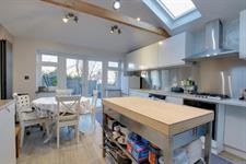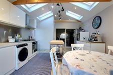 Double glazed French doors leading to the rear garden. Double glazed door to the side aspect. Twin double glazed windows to the rear aspect. Vaulted smooth ceiling with four 'Velux' skylights and inset spotlighting and beams. Matching wall and base units with contrasting work tops. Four ring gas 'Smeg' hob with extractor above. Inset sink and drainer. Additional units with a fitted oven. Space for two fridge/freezers and washing machine. Two modern vertical radiators.