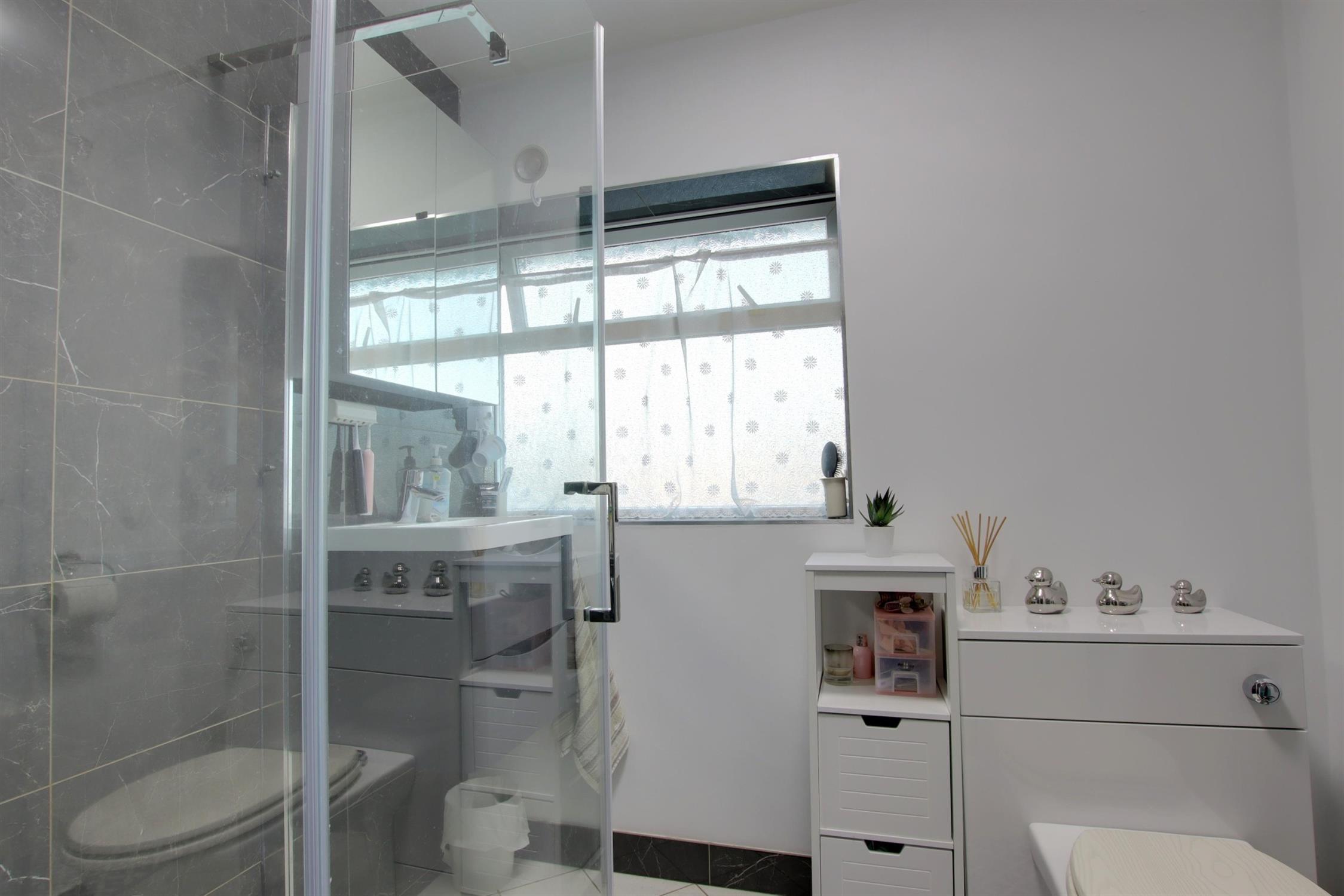 Double glazed window to the rear aspect. Smooth ceiling. Suite comprising shower cubicle. Concealed low level WC. Wash hand basin. Heated towel rail. Part tiled walls. Tile effect vinyl flooring.