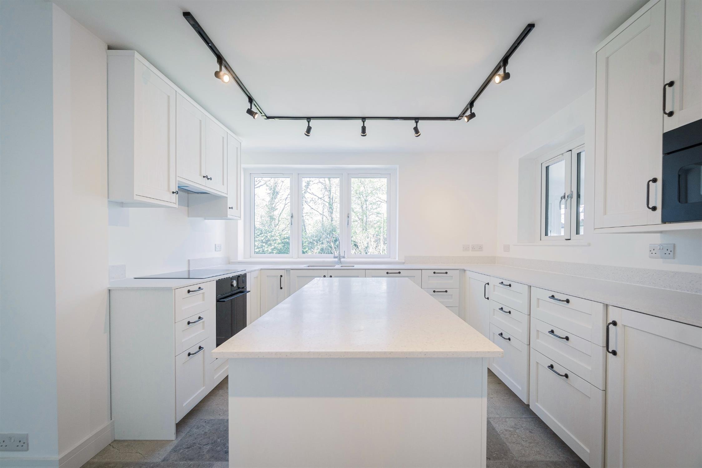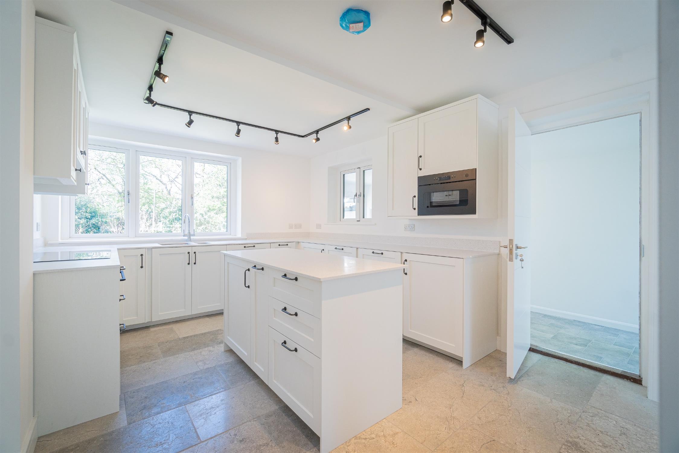 The kitchen/diner has been fitted with a comprehensive range of wall and base units with underfloor heating. There is a central wood burner on the opening into the dining area.