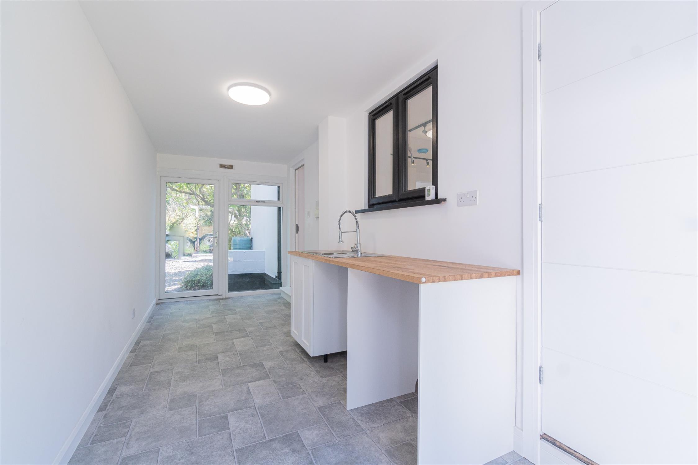 A spacious utility room gives access to a large garage space and access to the front and rear.