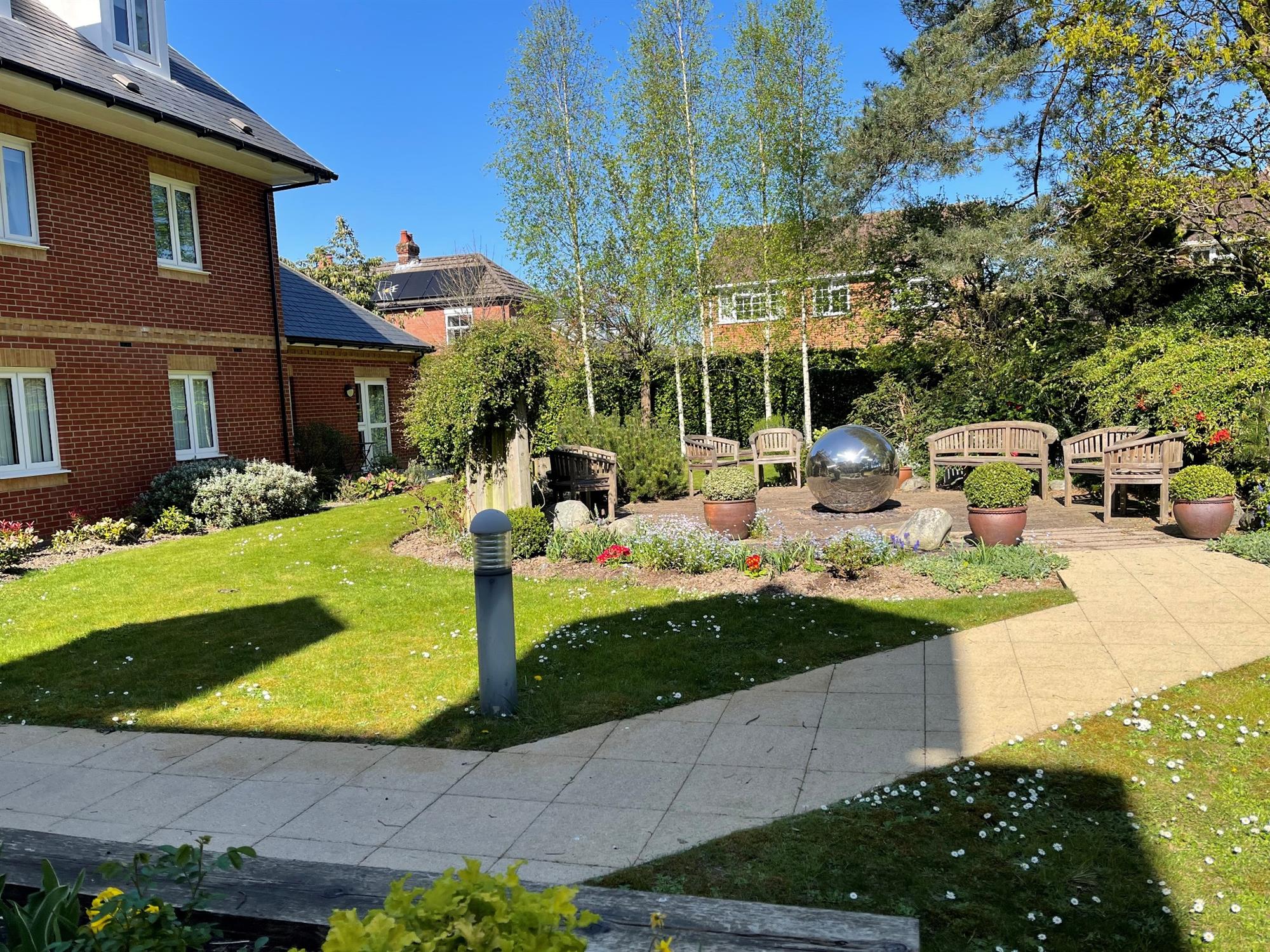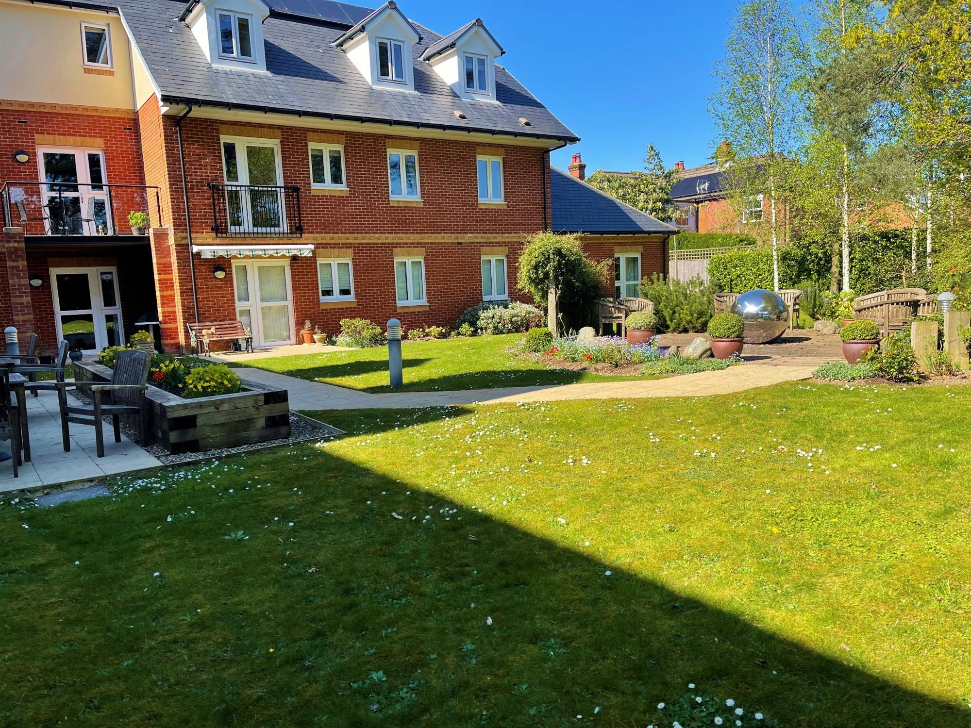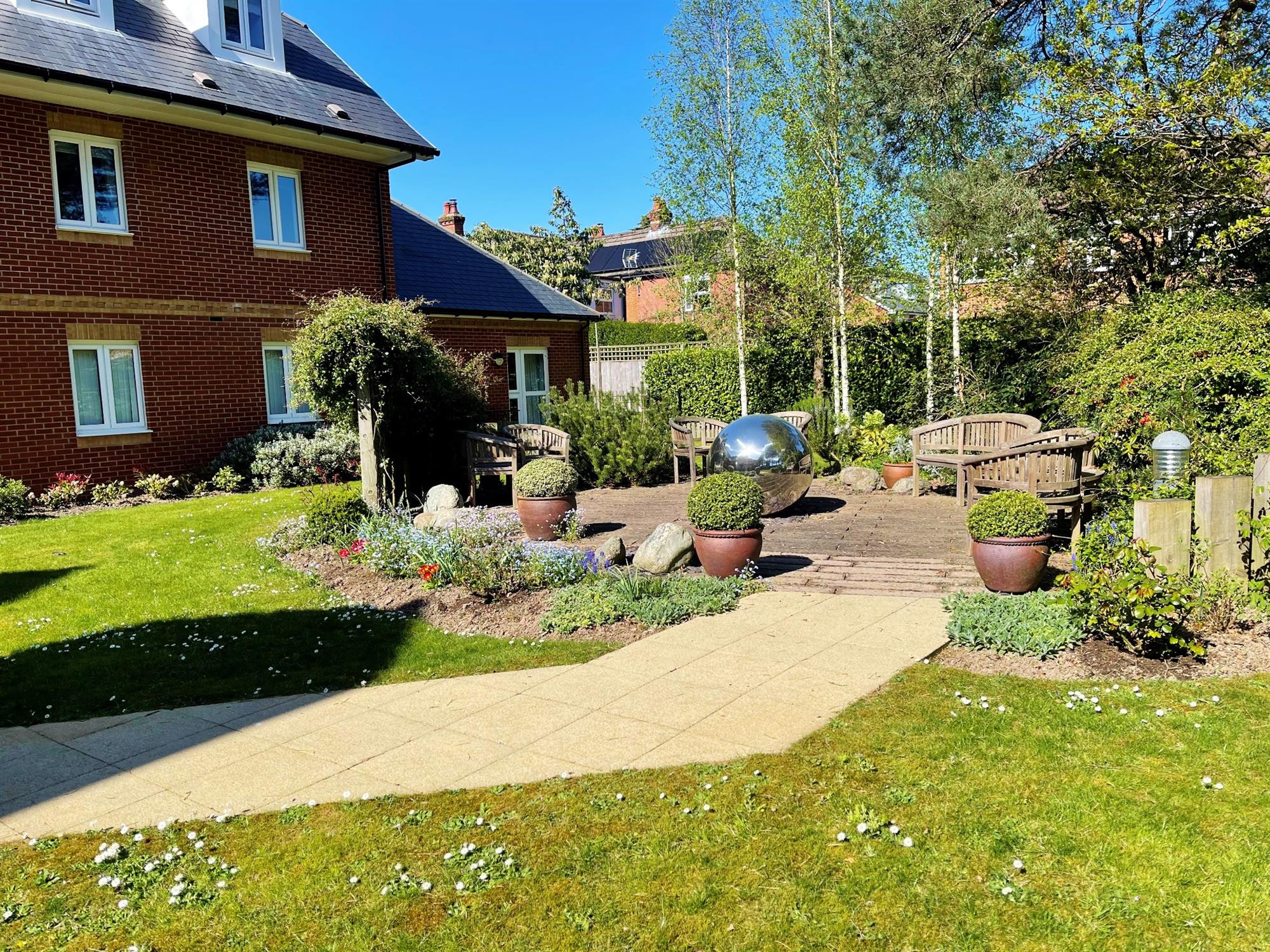 Paved seating area with raised planters. Further seating area with shrubs to borders. Landscaped gardens.