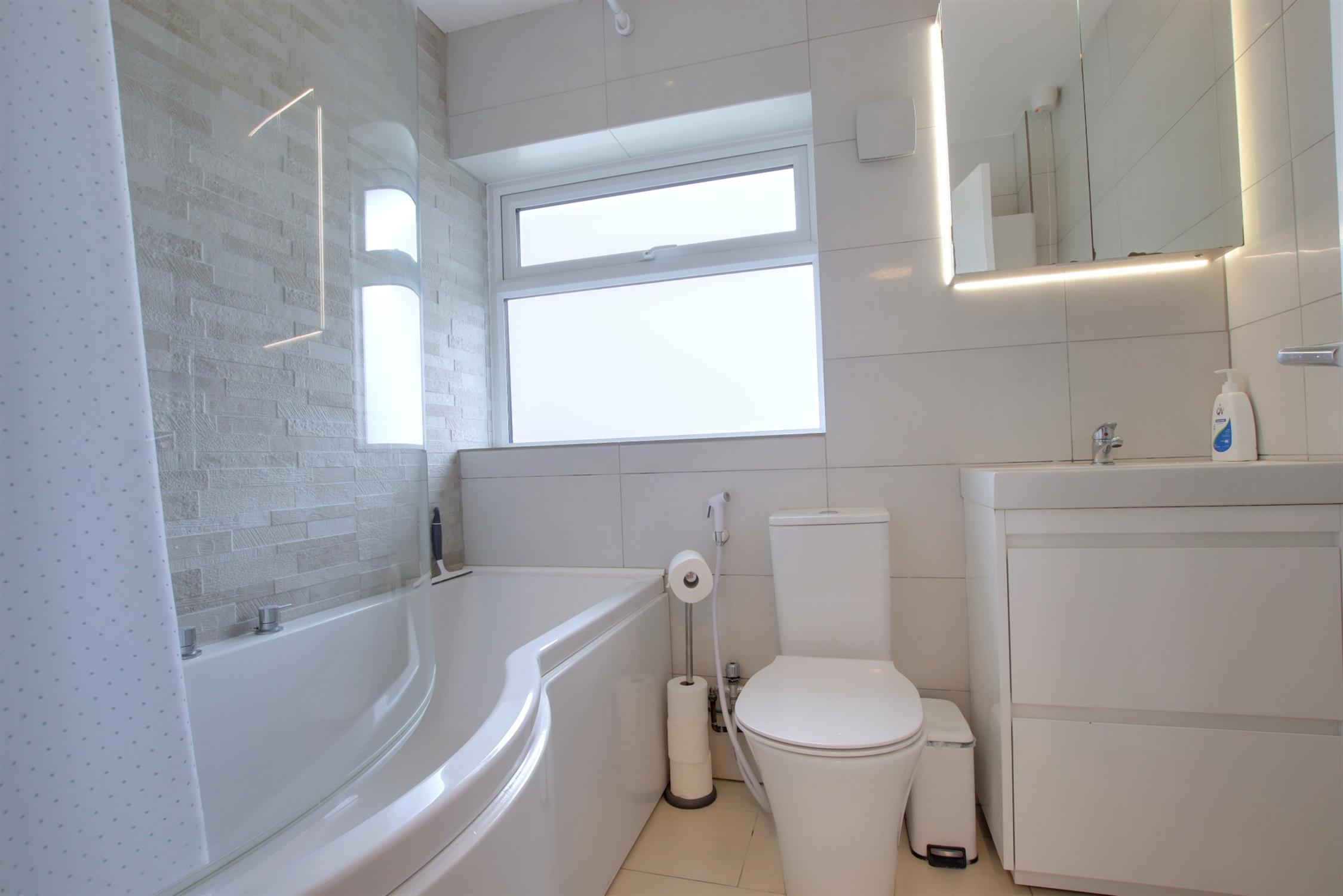 Double glazed window to the rear aspect. Smooth ceiling with inset spotlighting. 'P' shaped bath with 'Mira' shower over and screen. Low level WC. Wash hand basin. Heated towel rail. Tiled walls and flooring.