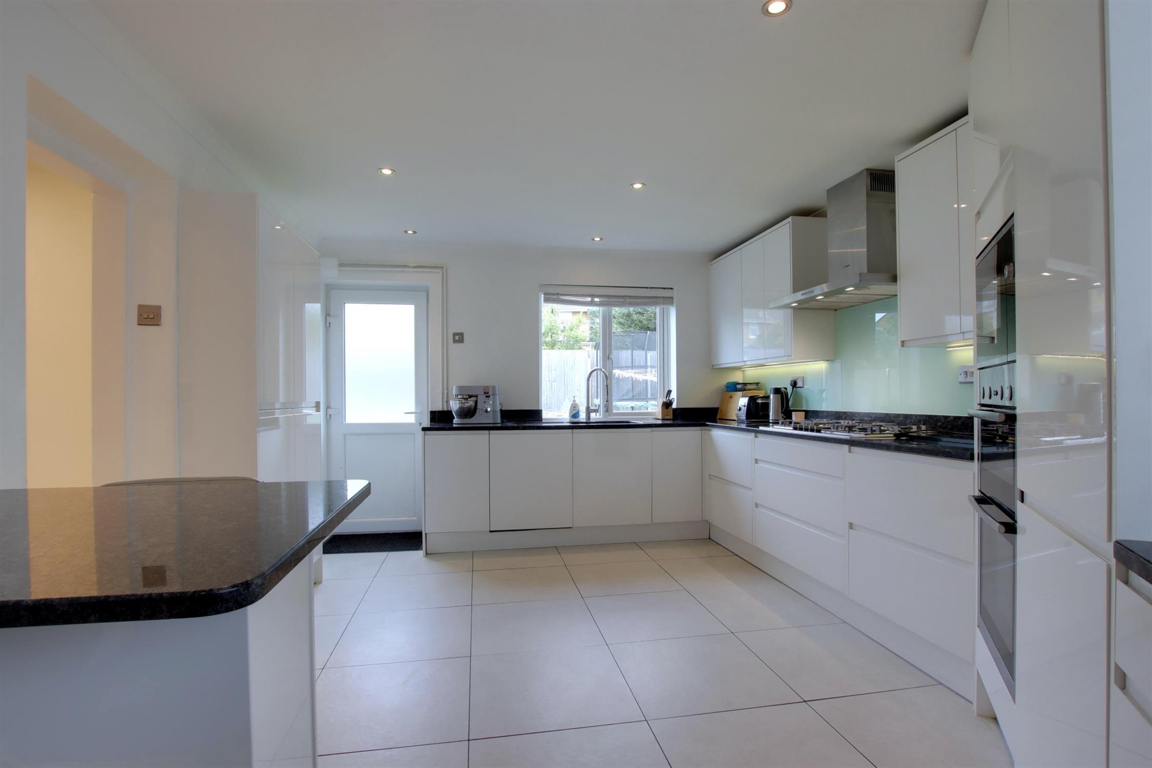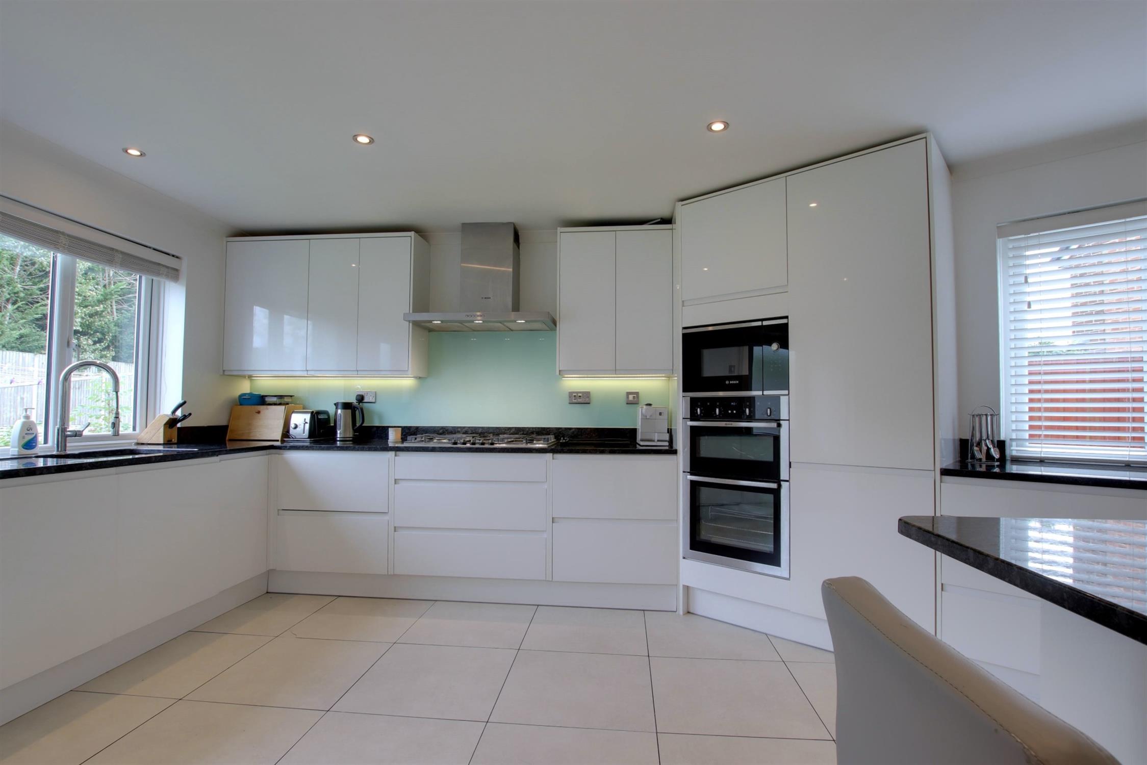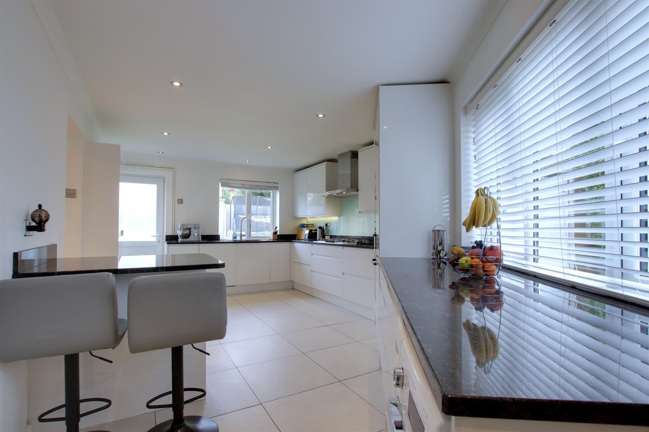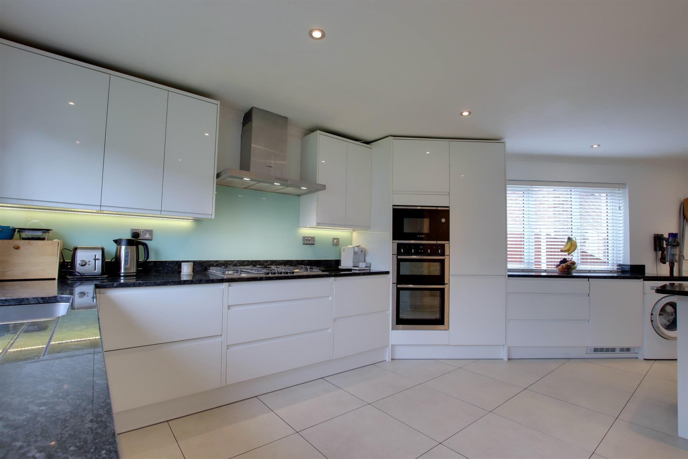Double glazed door leading to the rear garden. Dual aspect with double glazed windows to the rear and side aspect. Smooth ceiling with inset spotlighting. Matching wall and base units with granite worktops and upstand. Inset 'Franke' stainless steel sink and 'Franke' tap. Five ring gas hob with a glass splashback and 'Neff' extractor hood above. 'Neff' double oven and 'Bosch' microwave. Integrated dryer. Integral fridge/freezer and dishwasher (these appliances are not remaining and are negotiable). Space for washing machine. Under unit lighting. Breakfast bar with matching units and granite worktops. Tiled flooring. Electric underfloor heating.