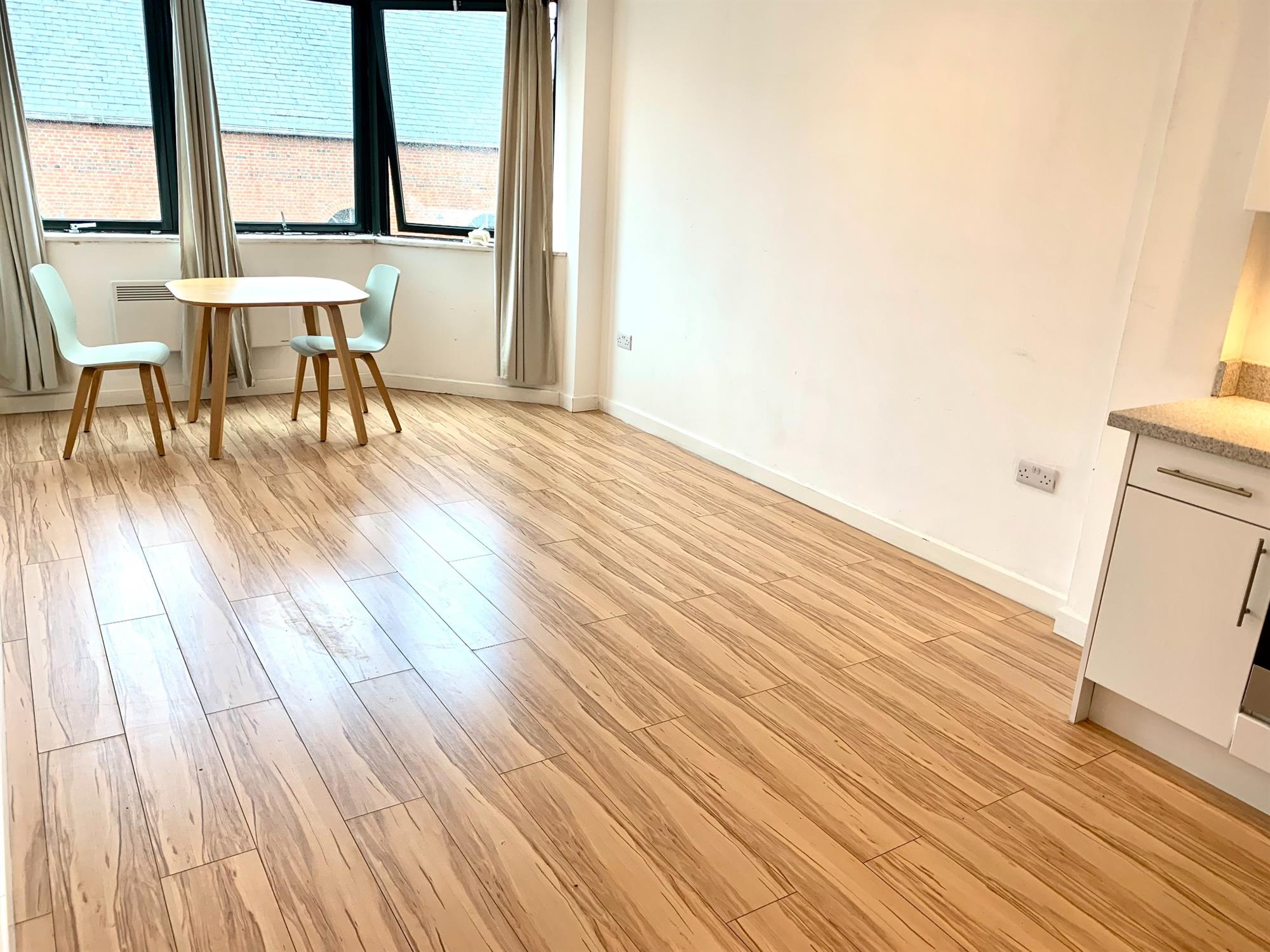 Laminate flooring with bay window allowing plenty of light. Table with chairs can stay or go.