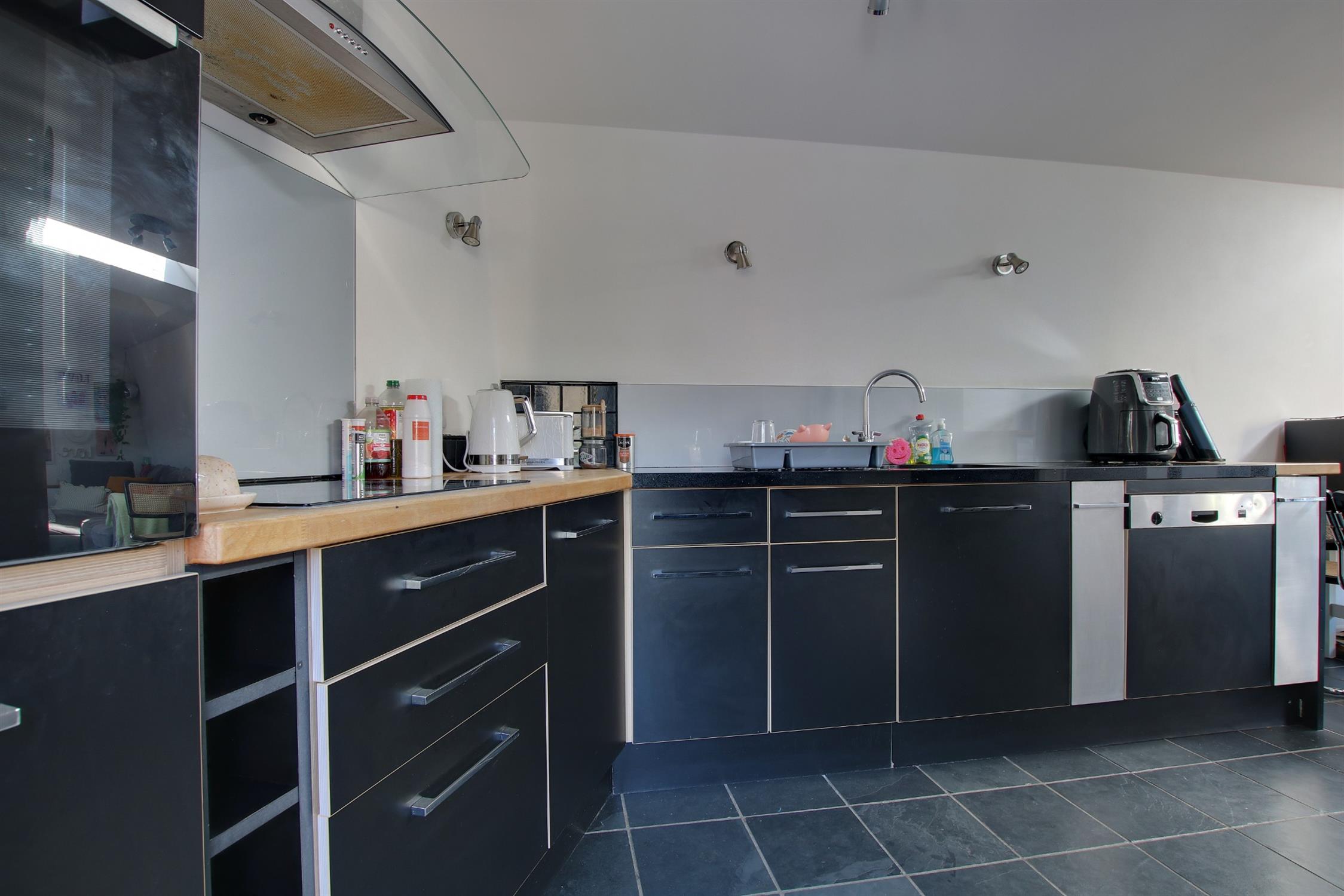 A contemporary range of units with worktop surfaces over. Integrated one and a half bowl stainless steel sink with swan neck mixer tap fitting. Splash backs to work surfaces. Built-in oven with electric hob and stainless steel finish chimney style extractor hood over. Three wall light points. Suitable space and plinth for fridge/freezer. Further wall light points. Double glazed, double doors leading to walk on balcony. Built-in corner cupboard with central heating boiler and additional pantry style cupboard over stairs with built-in shelving. Integrated fridge/freezer. Integrated wine rack and pull out bin drawer.