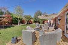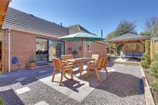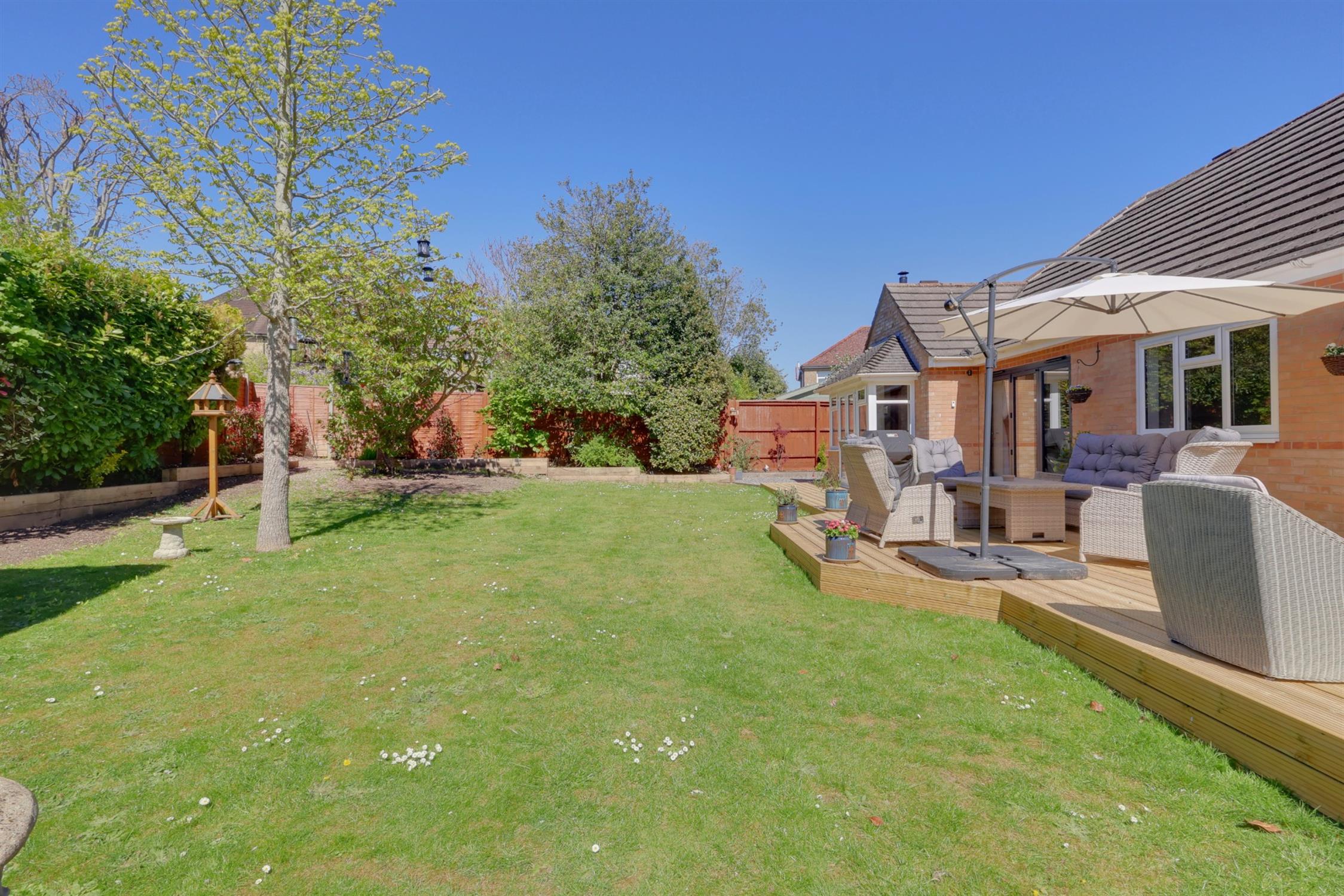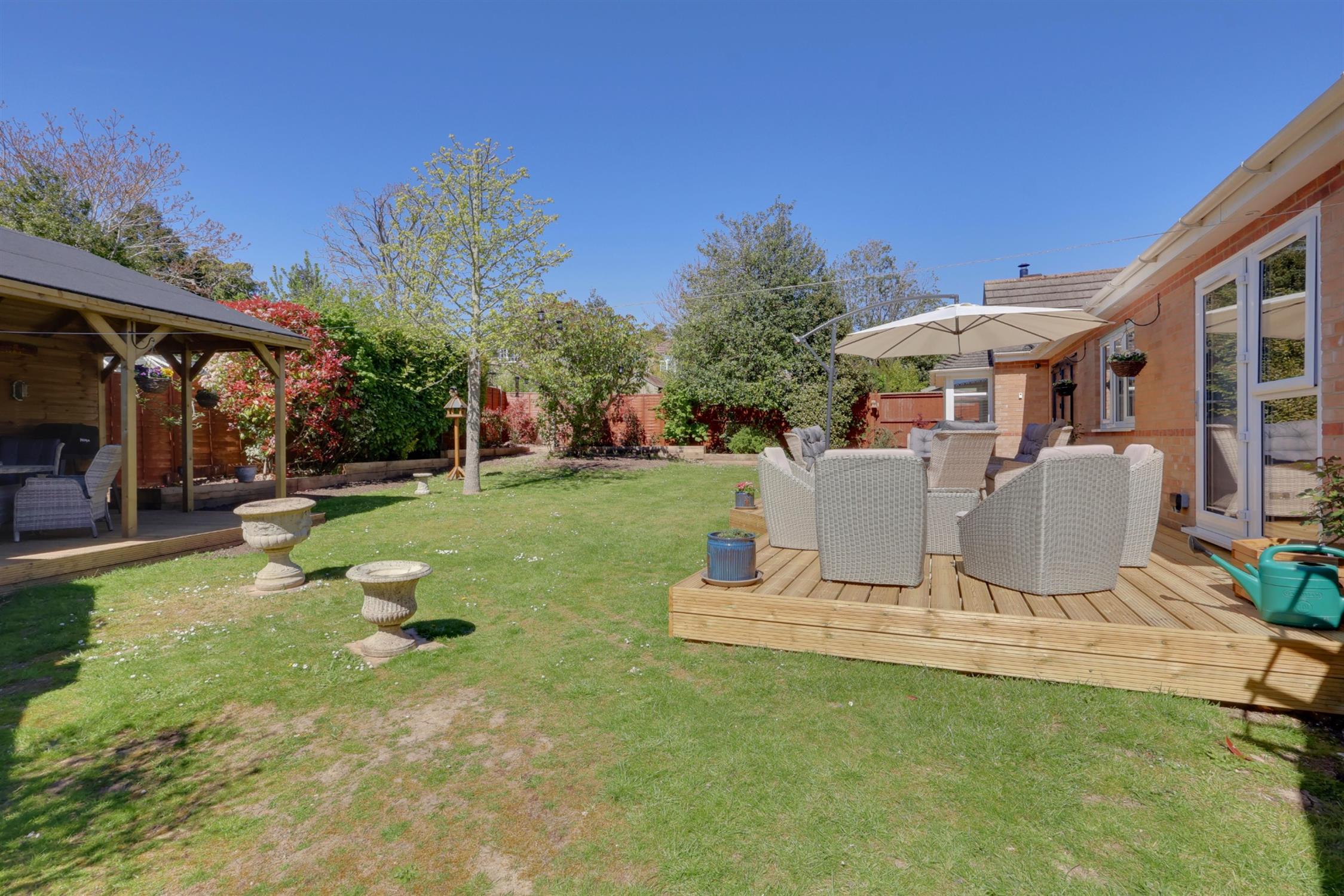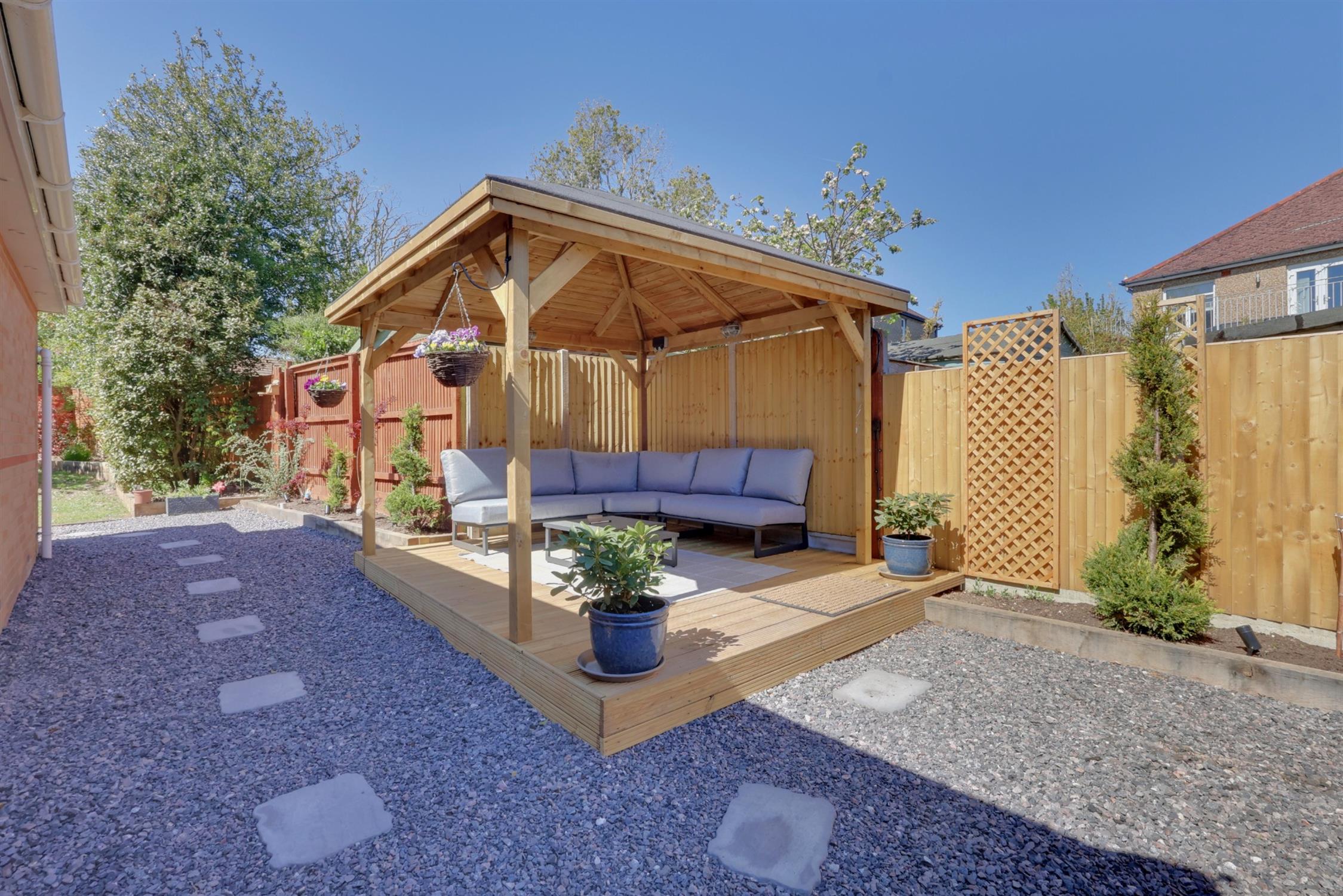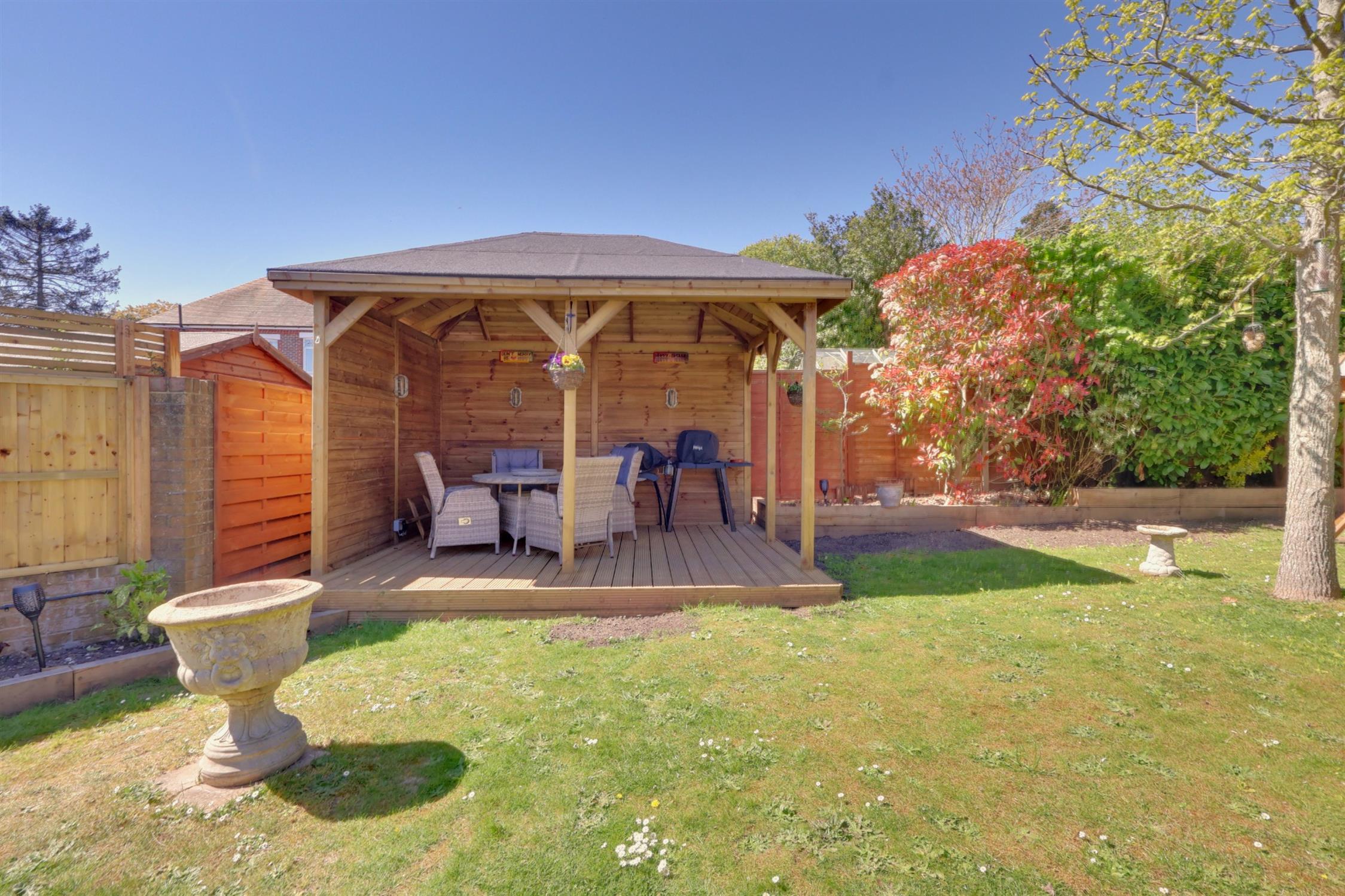 Laid to decking and lawn, mature shrubs and borders, Pergoda with power and light, gated side access, outside lighting.