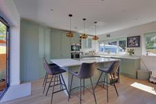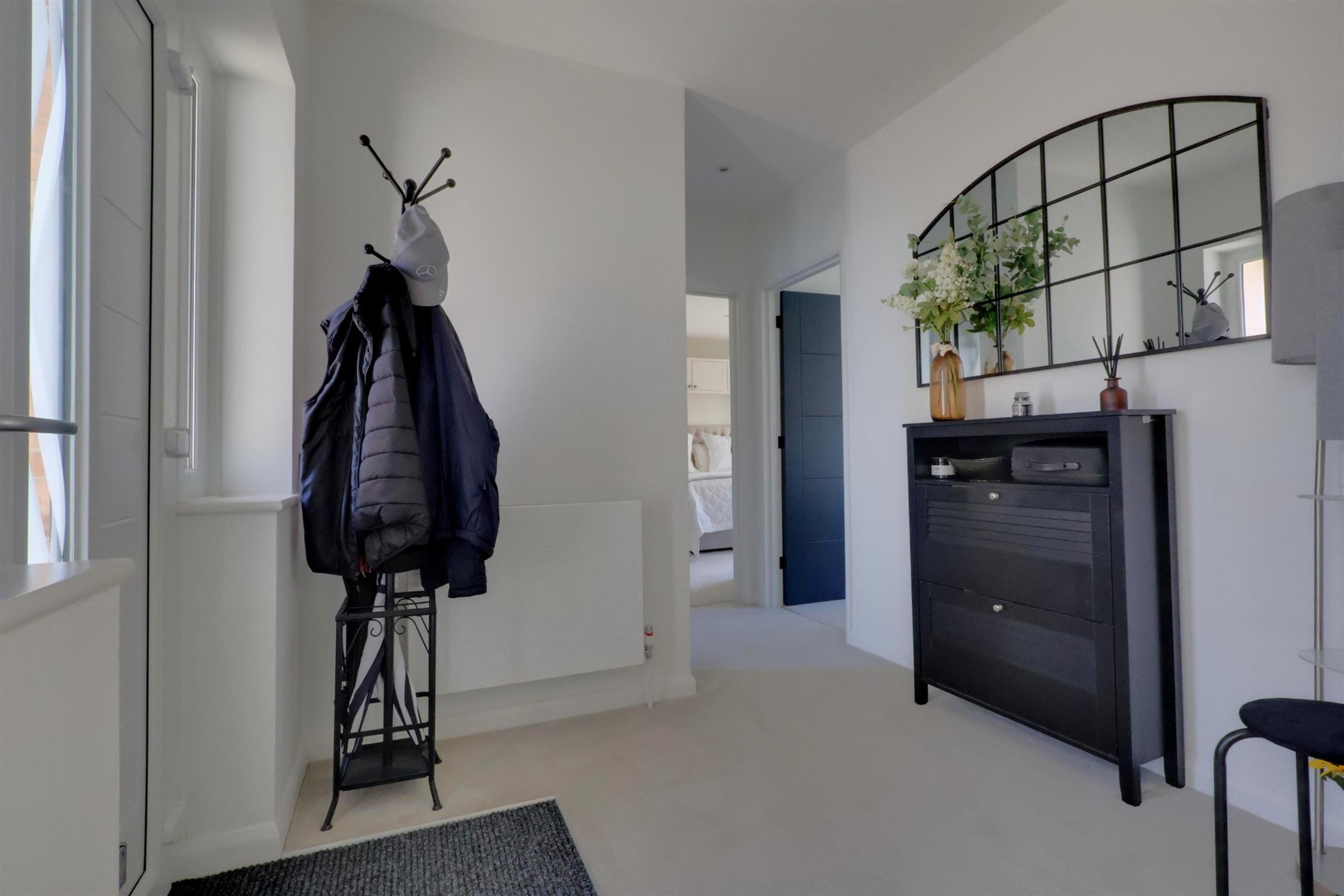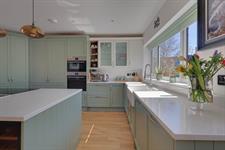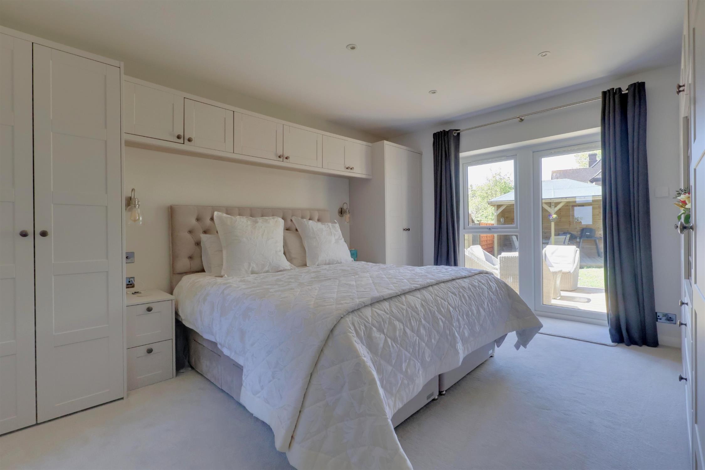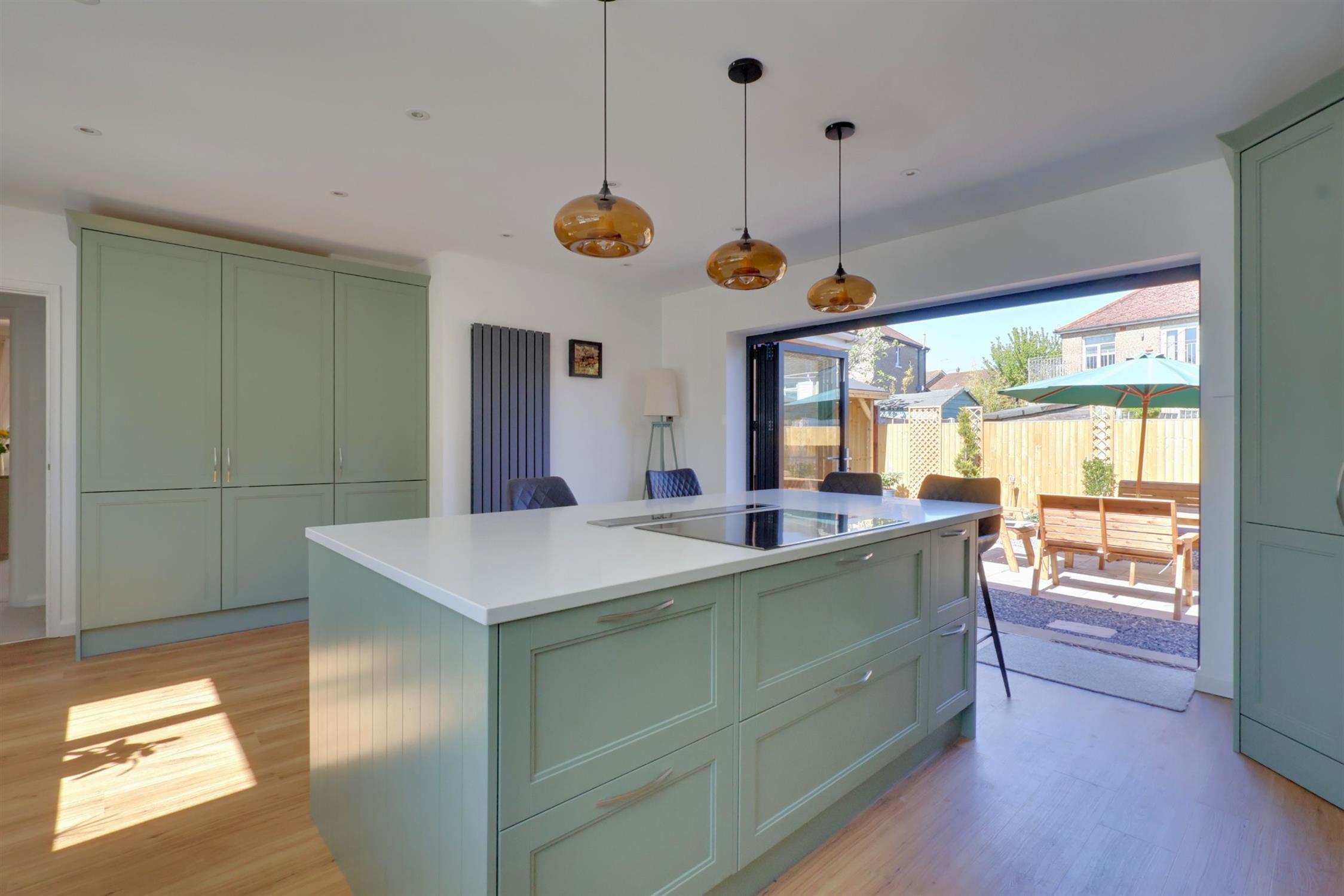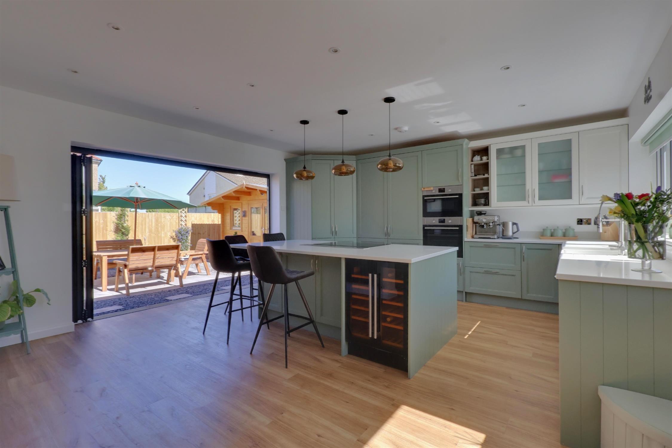 Two double glazed windows to the front aspect, double glazed Bi-fold doors to the side garden, a range of wall and base units with a Quartz work top, integral double Butler style sink with a mixer tap over, integral double oven with a built-in microwave, integral dishwasher, integral washer/dryer, integral American style fridge/freezer, integral pantry cupboard housing the fuses, central island with seating for four, induction five ring hob with integral extractor fan, double multi function wine cooler/warmer, ceramic vertical radiator, concealed wall mounted combi boiler, composite wooden flooring.