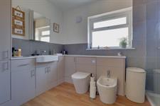 Obscure double glazed window, 4 piece suite comprising of: double walk in shower, bidet, close coupled wc, vanity wash basin with mixer tap, part tiled walls, extractor fan, wall mounted cabinet with built-in demister and light.
